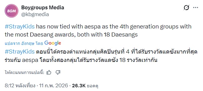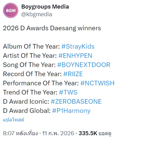 🔥 Stray Kids 'KARMA' ได้มีค่ำคืนแห่งความสำเร็จในงาน D-Awards ปี 2026 จัดขึ้นเมื่อวันที่ 11 กุมภาพันธ์ 2569 ณ สนามกีฬาฮวาจอง มหาวิทยาลัยเกาหลี กรุงโซล โดยสามารถชนะเลิศคว้ารางวัลใหญ่ “Album of the Year (Daesang)”