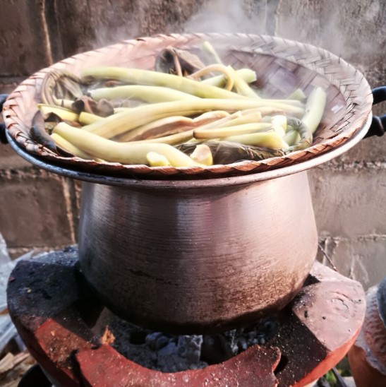 2. นำบอน ข่าหั่น หูหมูซอย ยอดส้มป่อยไปนึ่งให้สุกประมาณ 30 นาทีจนเละพักทิ้งไว้