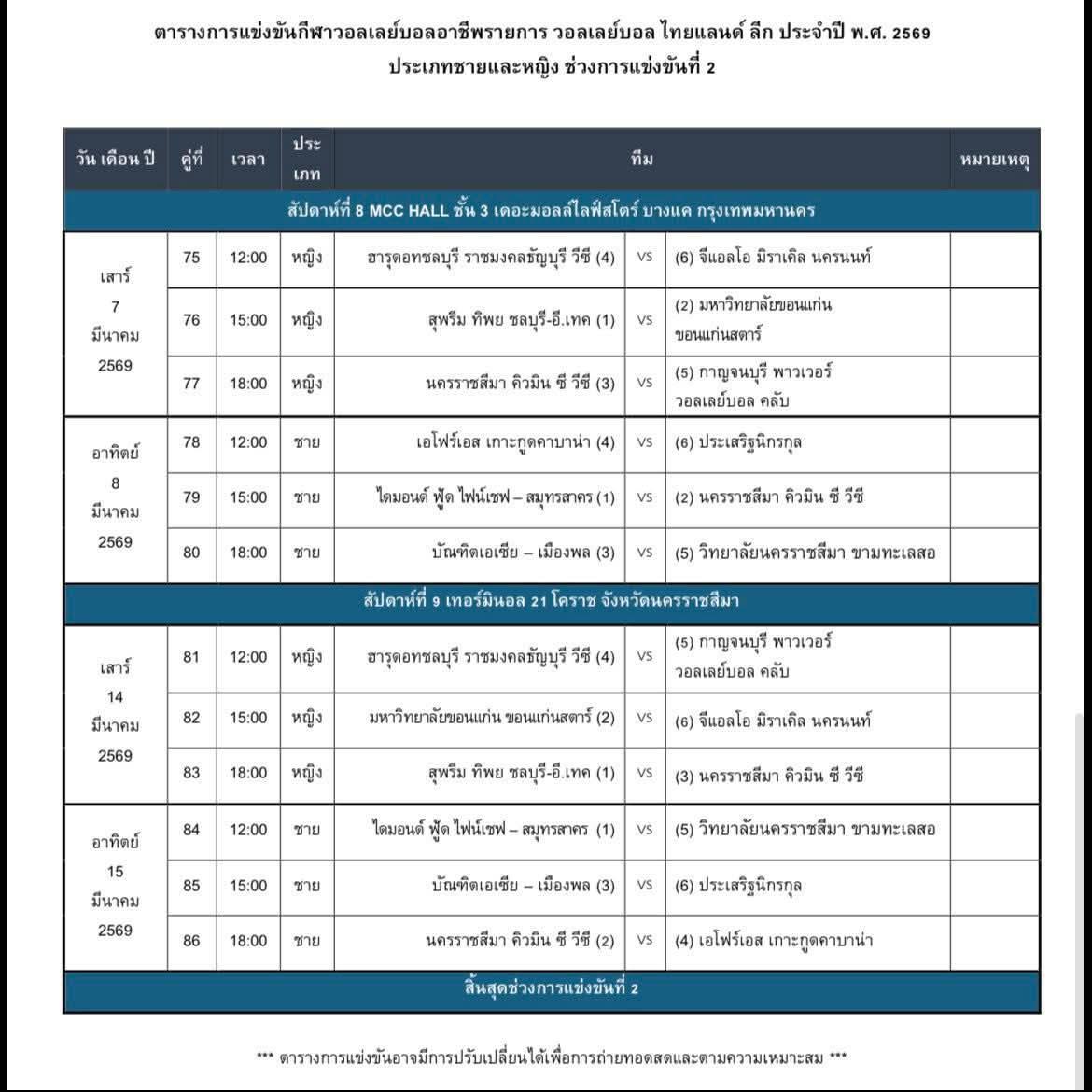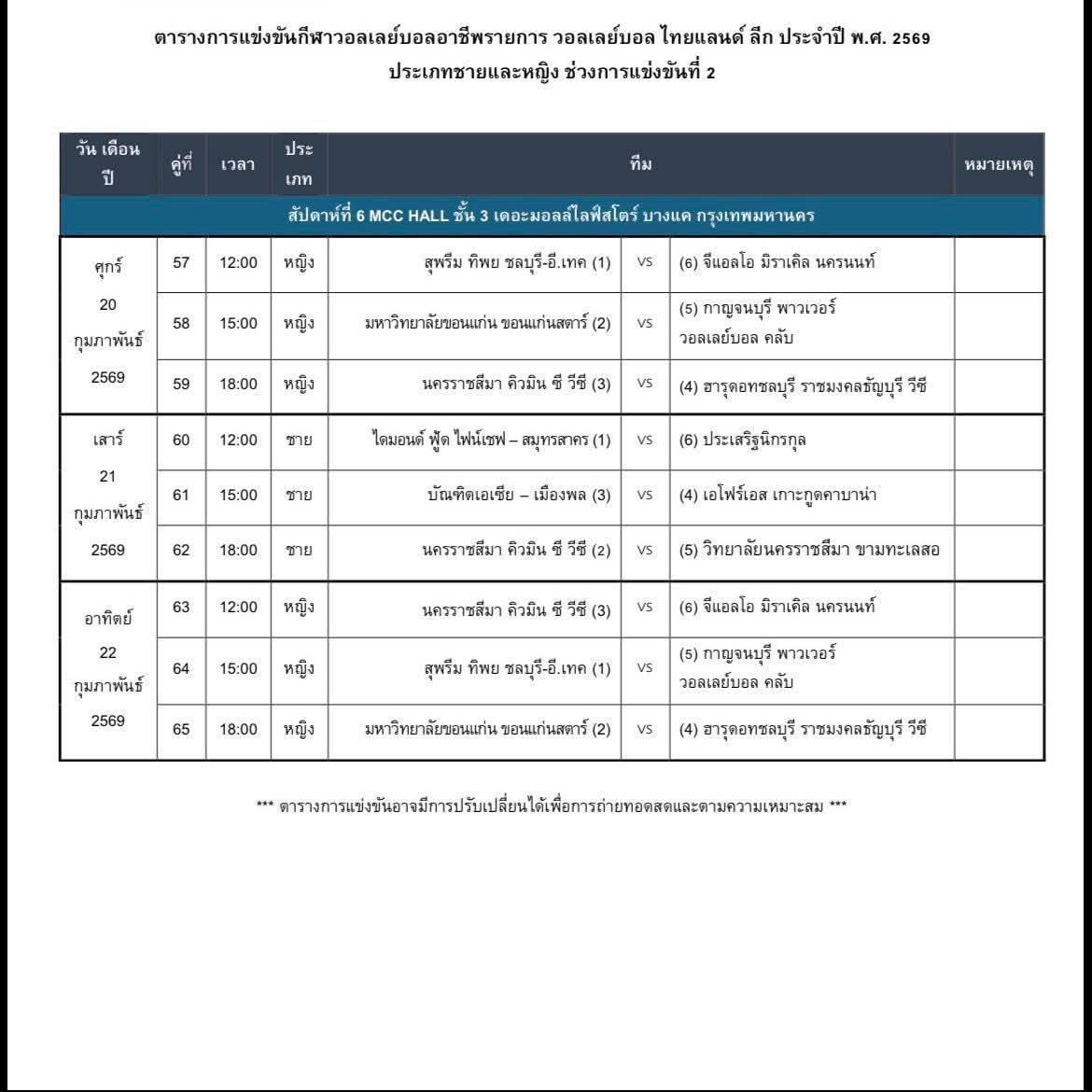 ไดกิ้น วอลเลย์บอลไทยแลนด์ลีก ครั้งที่ 16 ฤดูกาล 2020-21 เลก 2 - 3 มีนาคม 2564 กำหนดส่งรายชื่อนักกีฬาเลก 2 - 5 มีนาคม 2564 ประกาศรายชื่อนักกีฬาเลก 2 - 6 มีนาคม 2564 เริ่มแข่งขันเลก 2 - นับคะแนนใหม่ทั้ง