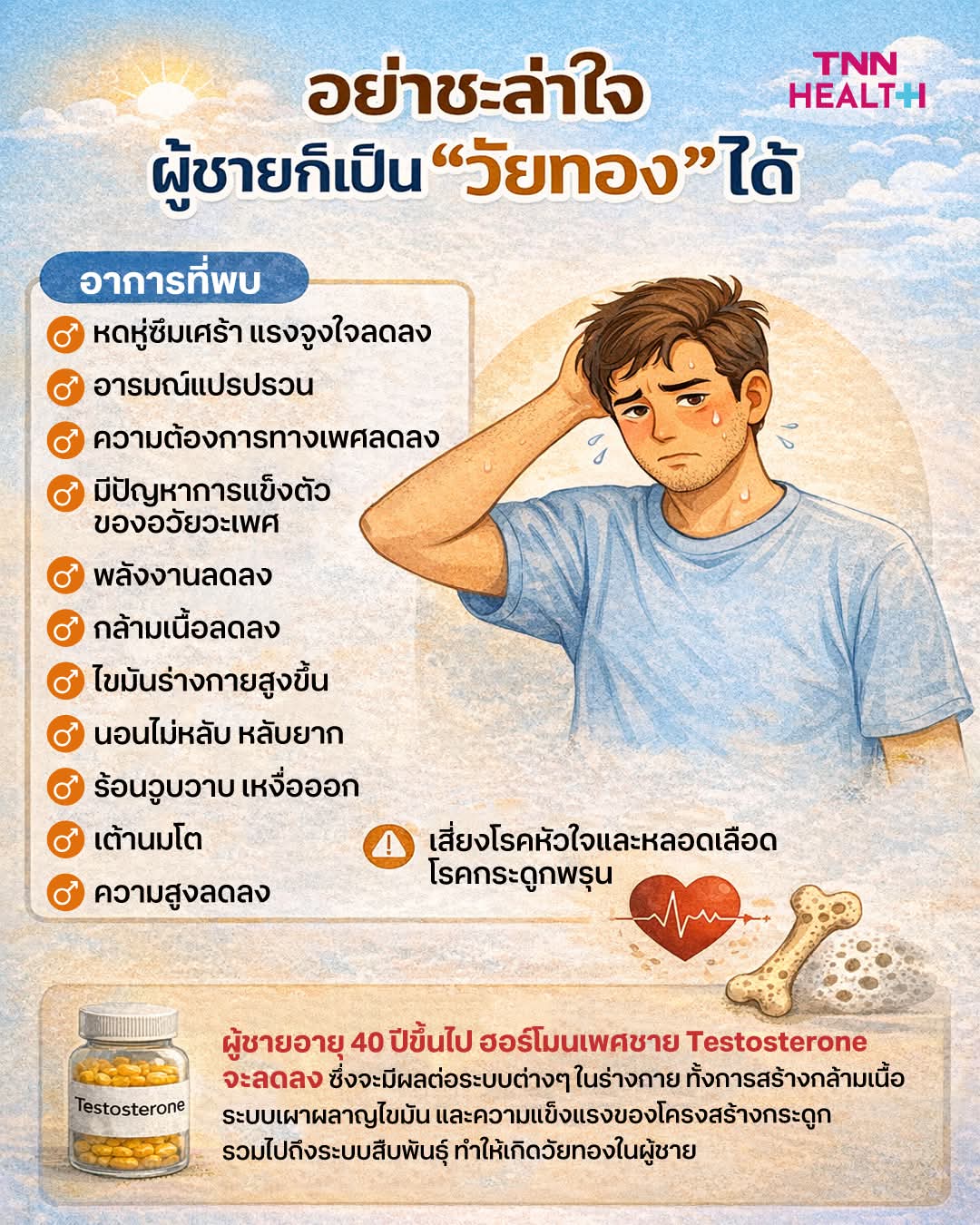 ผู้ชายหลายคนมักจะละเลย คิดว่าเป็นแค่ความเหนื่อยล้าสะสมจากการทำงาน หรือคิดว่า "วัยทอง" เป็นเรื่องของผู้หญิงเท่านั้น แต่ในความเป็นจริง "วัยทองผู้ชาย" (Andropause) มีผลกระทบต่อคุณภาพชีวิตไม่แพ้กันค่ะ