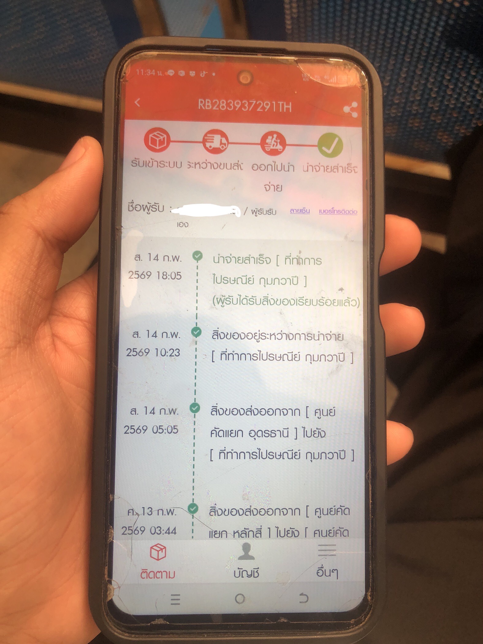 กำหนดส่งพัสดุ 03/02/69 แต่ส่งจริง 04/02/69 แต่พนักงานขอเลื่อนส่งจากนั้นก็ไม่ได้มีความคืบหน้าเลย 07/02/69 เลยไปเอาของที่คลัง ราษฎร์บูรณะ แต่พนักงานในนั้นบอก พนักงานที่ไปส่งของยังไม่เอาของกับเข้าคล