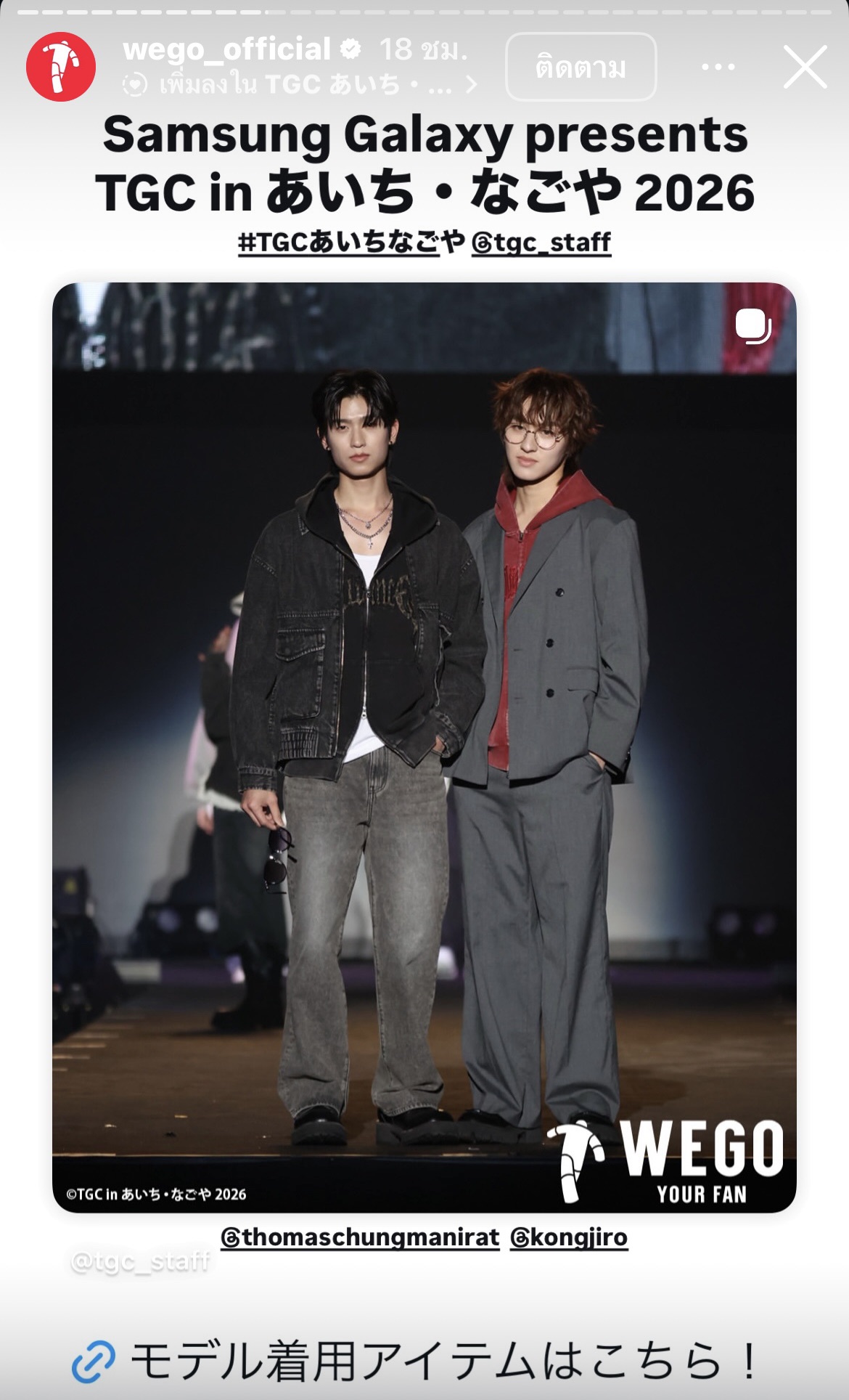 โทมัสก้องเดินแบบในงาน TGC Aichi Nagoya 2026 ประเทศญี่ปุ่นครั้งแรก กับแบรนด์ WE GO เมื่อวันที่ 15 กุมภาพันธ์ 2569