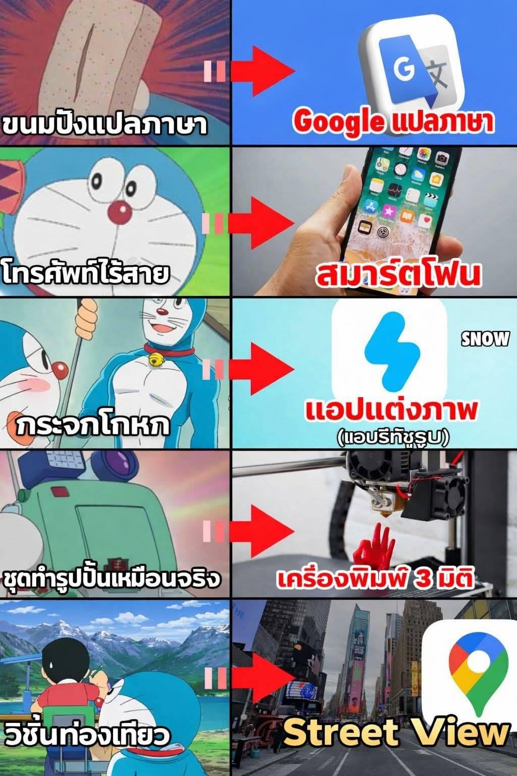 ชาวเน็ตญี่ปุ่นแชร์ภาพมีมของวิเศษในการ์ตูนโดราเอมอนยุค 80-90 มาเทียบกับเทคโนโลยีสมัยใหม่ พบหลายอย่างเป็นจริงแล้วในปัจจุบัน เช่น