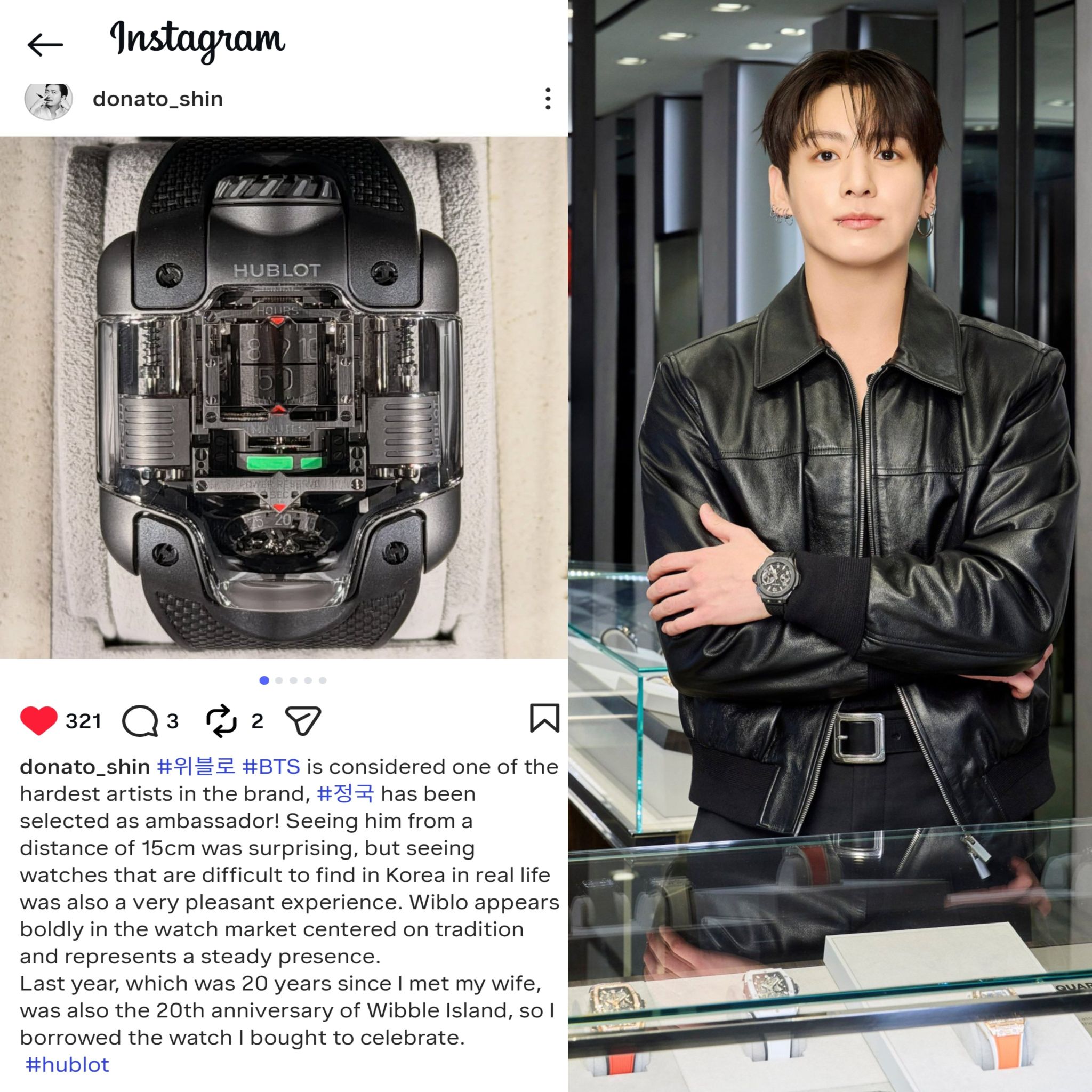 "#BTS #จองกุก ถูกยกให้เป็นหนึ่งในศิลปินที่แบรนด์ต่าง ๆ คว้าตัวมาได้ยากที่สุด แต่เขาได้รับเลือกให้เป็นแอมบาสเดอร์ของ #Hublot! การได้เห็นเขาในระยะใกล้เพียง 15 ซม. นั้นน่าทึ่งมาก แต่การได้เห็นนาฬิกาตัวจริงที่หาดูได้ยากในเกาหลีก็เป็นประสบการณ์ที่น่ายินดีเช่นกัน Hublot ปรากฏตัวอย่างโดดเด่นในตลาดนาฬิกาที่ยึดถือขนบธรรมเนียมดั้งเดิม และยังคงรักษาตัวตนได้อย่างมั่นคง