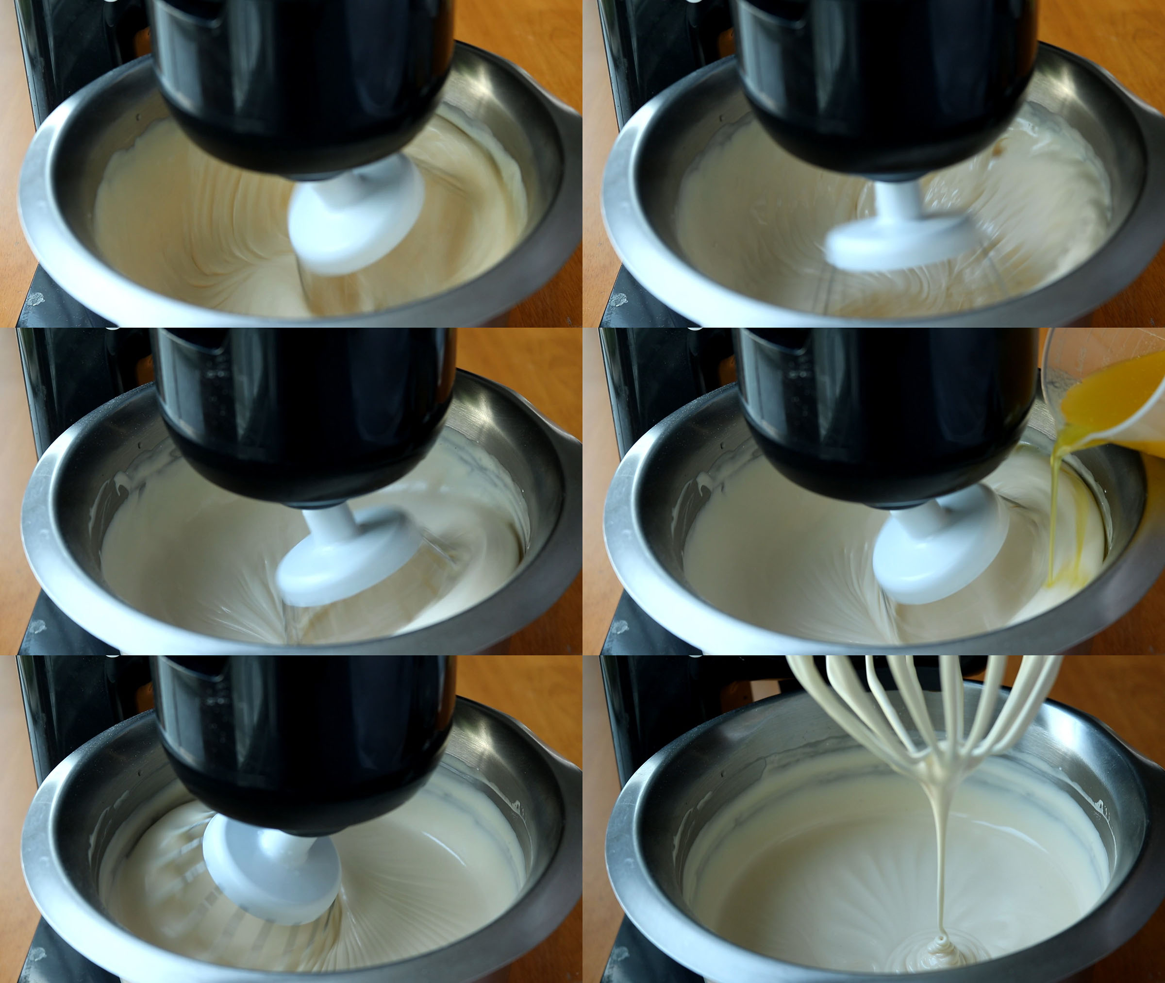 2.ค่อยๆใส่เนยละลายลงไป เป็นสายแบบนี้ค่ะพอใส่น้ำมันรำข้าวหมดแล้วให้ตีต่ออีก 3-5 นาทีค่ะ