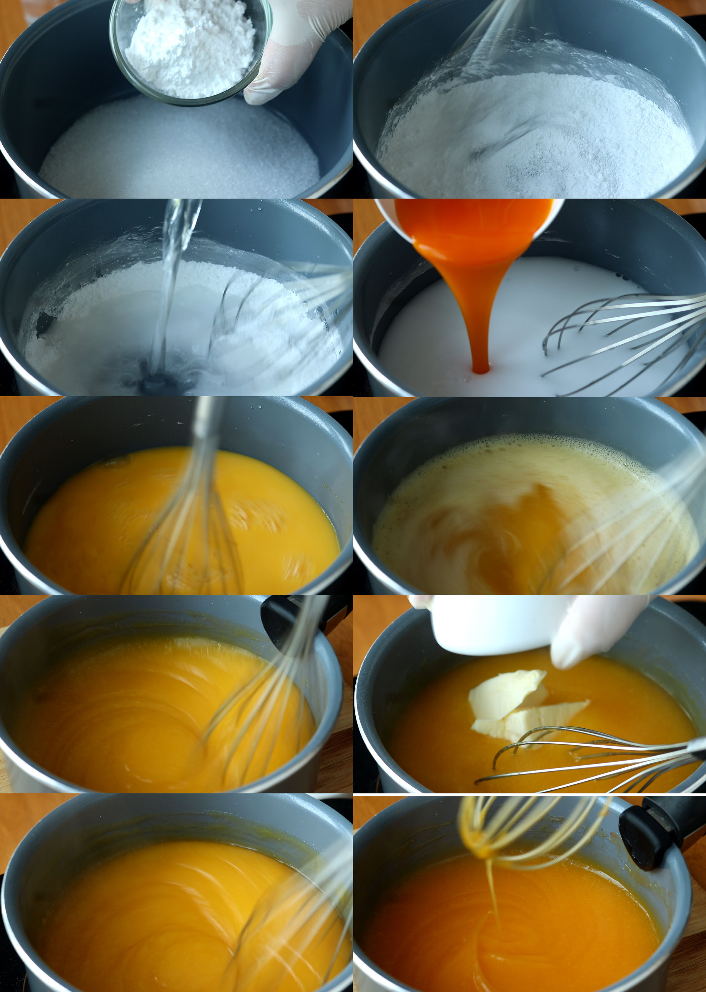 ทำซอสส้มกันจ้ะ ใส่น้ำตาลทราย แป้งกวนไส้ คนให้เข้ากัน จากนันเติมน้ำเปล่าและน้ำส้มเข้มข้น คนให้เข้ากัน จากนั้นนำไปกวนบนเตาด้วยไฟกลางไปทางอ่อน กวนตลอดจนซอสข้นข้น เวลากวนมีรอยตะกรอ จากนั้นปิดเตาใส่เนยสดลงไป คนให้เข้ากัน คนให้คลายร้อน จนได้ความข้นเหลวตามต้องการ