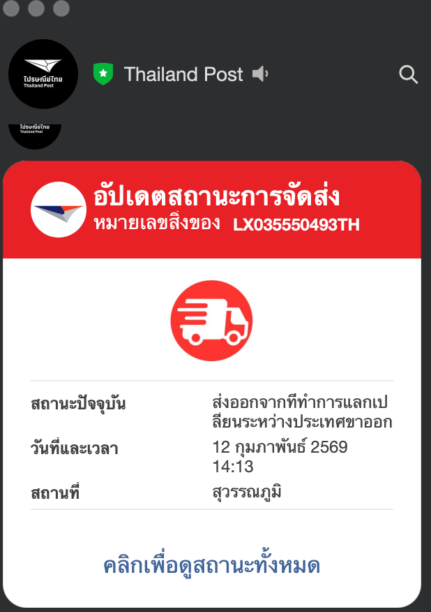 เนื่องจากมีพัสดุสำคัญส่งมาจากไทยให้ตั้งแต่วันที่ 10 แต่สเตตัสในเว็บไซต์และในไลน์ค้างอยู่ที่วันที่ 12