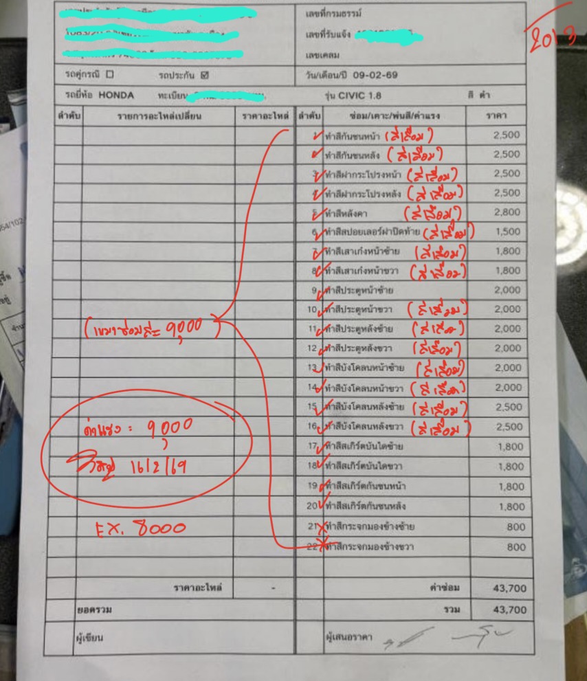 เครมประกันภัยชั้น 1 ไทยวิวัฒน์ ไม่มีคู่กรณี เครมสีรอบคัน ทำประกันมา 7 ปี ประกันบอกว่าสีเสื่อมคุณภาพมีส่วนต่าง