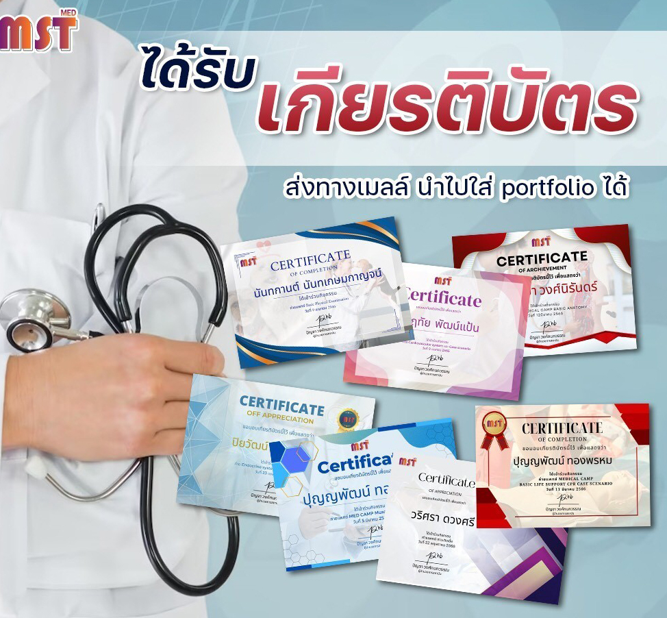 - เกียรติบัตร (e-Certificate) สำหรับใช้ใส่ Portfolio ยื่นเข้าคณะแพทยศาสตร์ได้ทั่วประเทศ