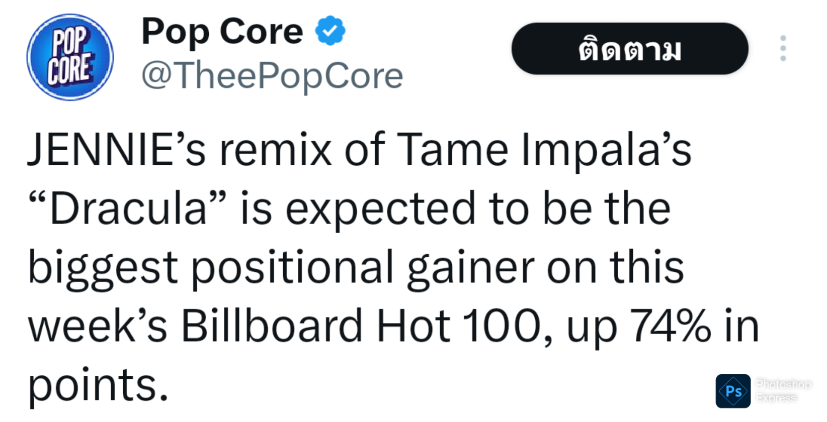 คาดว่าเพลง Dracula ของ Tame Impala Remix โดย JENNIE มีโอกาสมากที่จะอันดับสูงขึ้นอย่างมากบน Billboard Hot 100 Chart