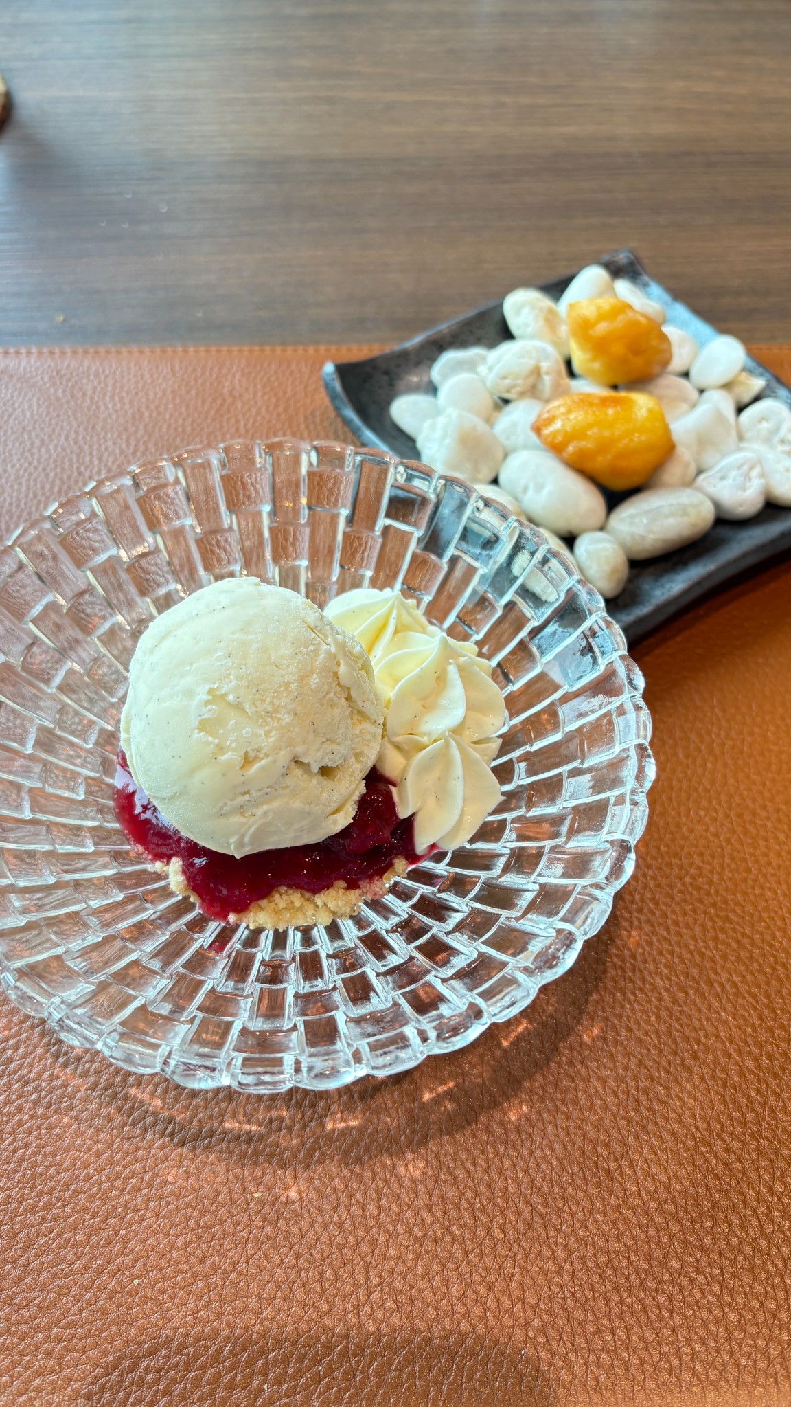 ไอศกรีมวานิลลาหอมชัดมาก เห็นเมล็ดวานิลลาแท้ผสมอยู่ทั่วเนื้อไอศกรีม รสไม่หวานจัด ละลายช้ากว่าปกติ เบอร์รี่คอมโพตมีรสเปรี้ยวสดชื่น ช่วยเสริมรสได้ดี เชฟเสิร์ฟแถม Madeleine (ขนมไข่ฝรั่งเศสรูปเปลือกหอย) วางมาบนจานที่ตกแต่งด้วยก้อนหิน