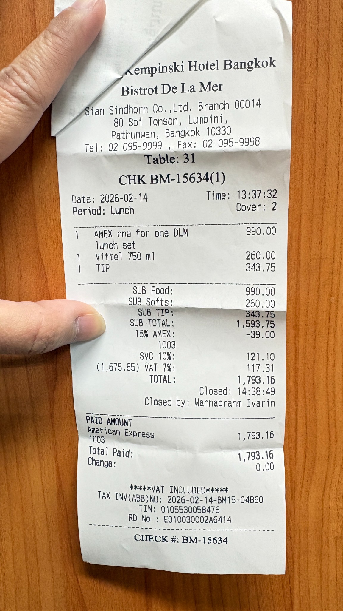 เราทิปเพิ่ม 25% รวมทั้งสิ้น 1,793 บาท