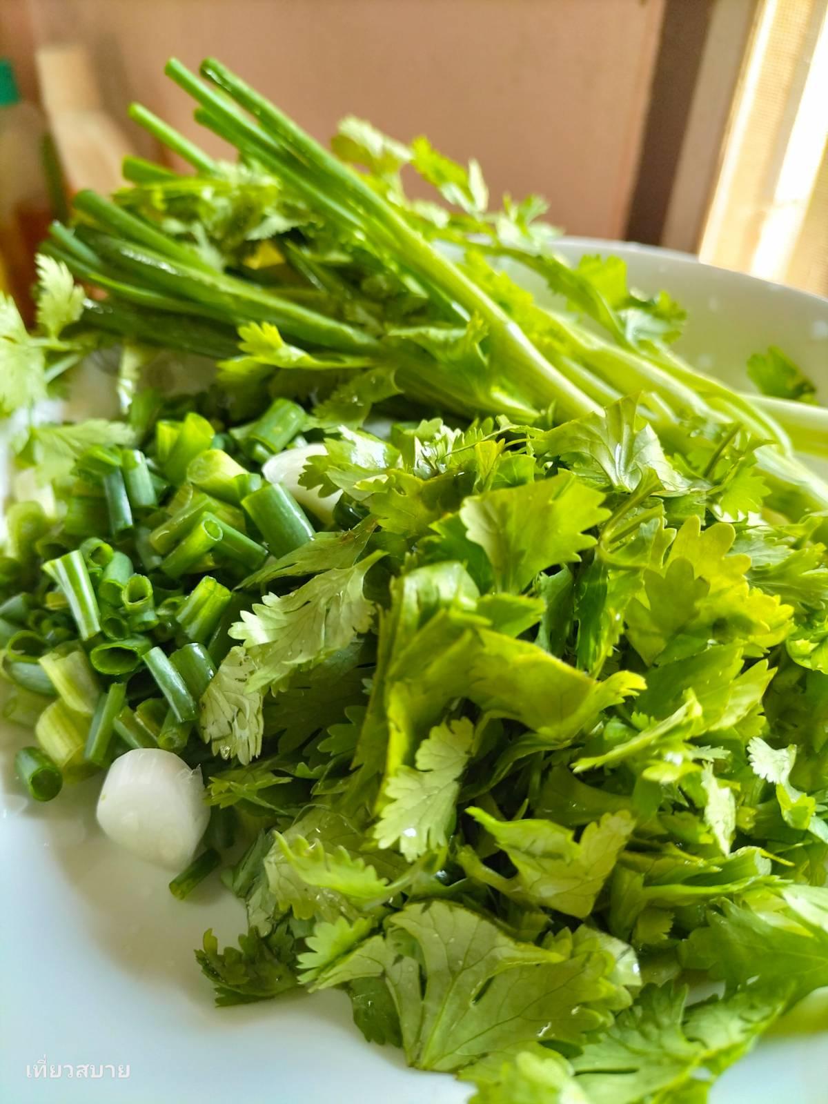 5. ปิดท้ายด้วยต้นหอม ผักชีซอย คลุกเร็ว ๆ แล้วยกลง