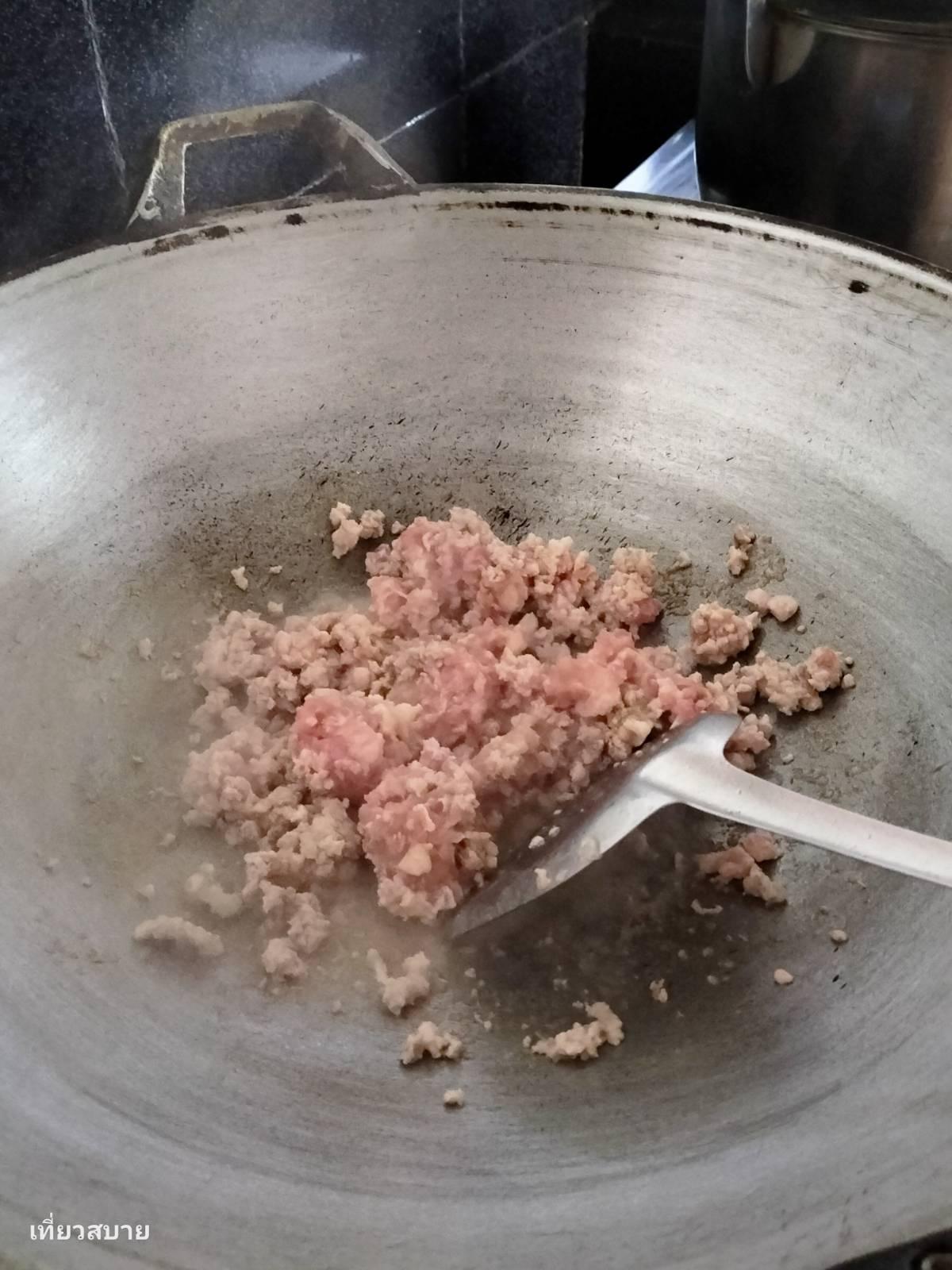 2.ตั้งกระทะใส่น้ำมันเล็กน้อย ใส่กระเทียมลงผัดให้หอม