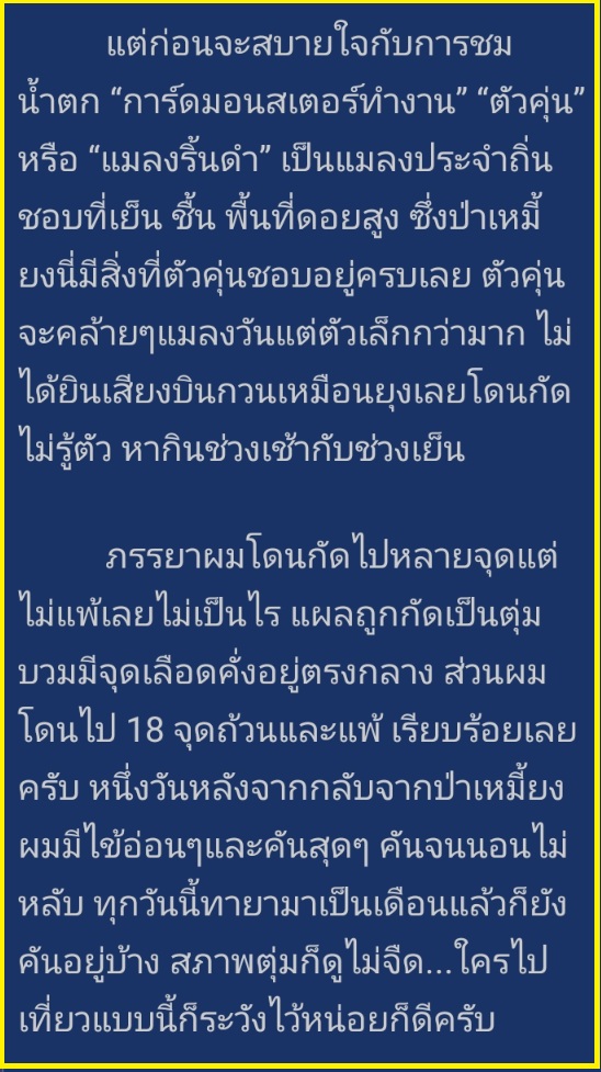 ขออนุญาตนำข้อความจากกระทู้ของคุณ "วิวริมหน้าต่าง" ซึ่งรีวิวการไปเที่ยวที่บ้านป่าเมี่ยง และได้ถูกแมลงชนิดนี้กัดมากถึง 18 จุดก็ยังไม่เป็นไร แต่แผลจะหายช้ามาก