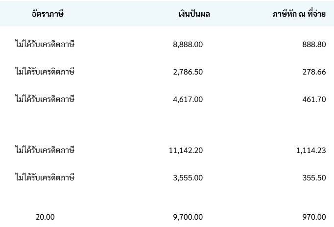 การหักภาษี ณ ที่จ่าย: เงินปันผลจาก REIT จะถูกหักภาษี ณ ที่จ่าย 10% และเป็น (Final Tax) ซึ่งเป็นภาษีหัก ณ ที่จ่ายที่หักแล้วหักเลย ไม่นิยมนำมารวมคำนวณเป็นรายได้ตอนปลายปี