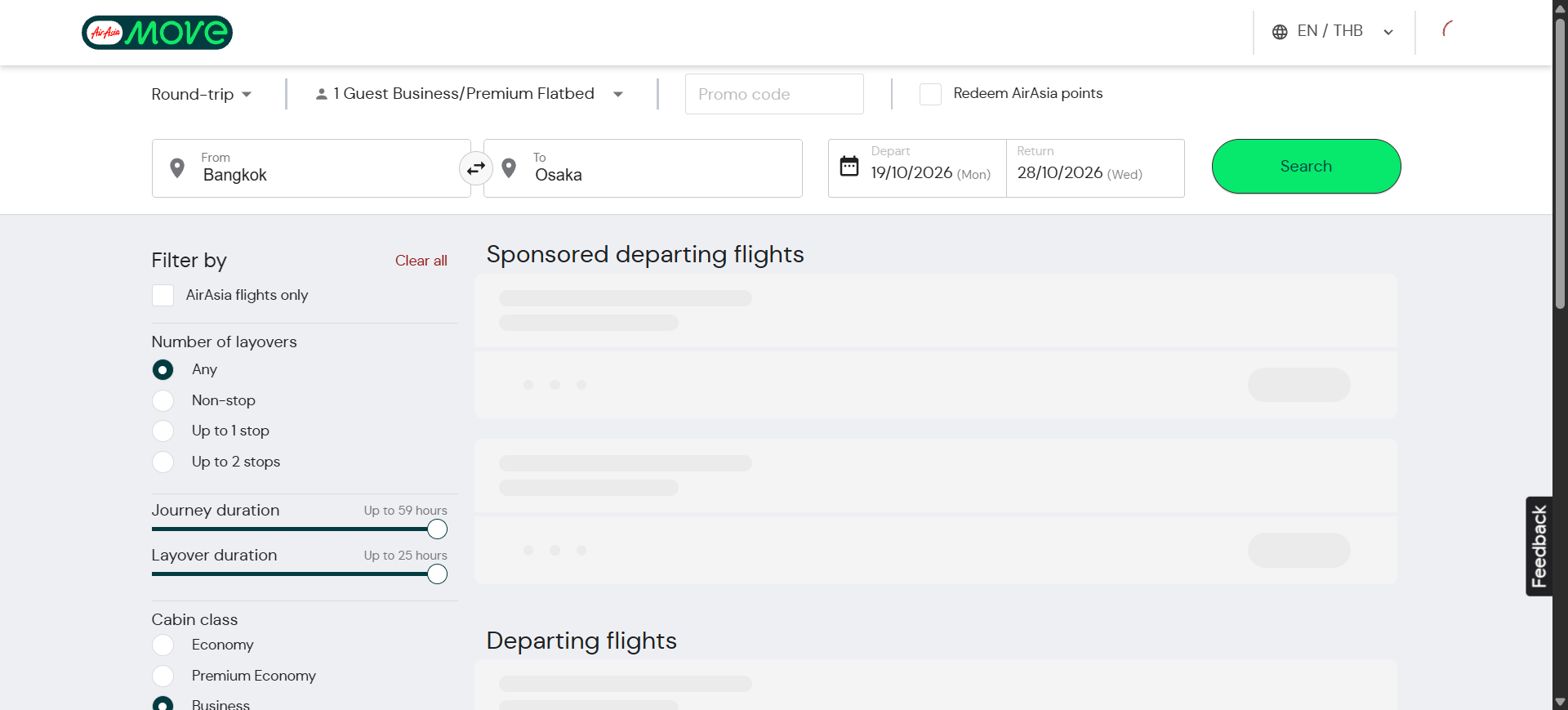 วางแผนจะไปเที่ยวโอซาก้า เดือน ตค อยากลองใช้ Flat Bed AirAsia เข้า website airasia move (สีเขียว) กรอกข้อมูลเรียบร้อยกด search แต่ปรากฏว่าเว็ปไม่โหลด ค้างไปเฉยๆ ลองกด refresh ดูอีก 2-3 ที ก็เจอปัญหาเดิม เลยอยากทราบว่า