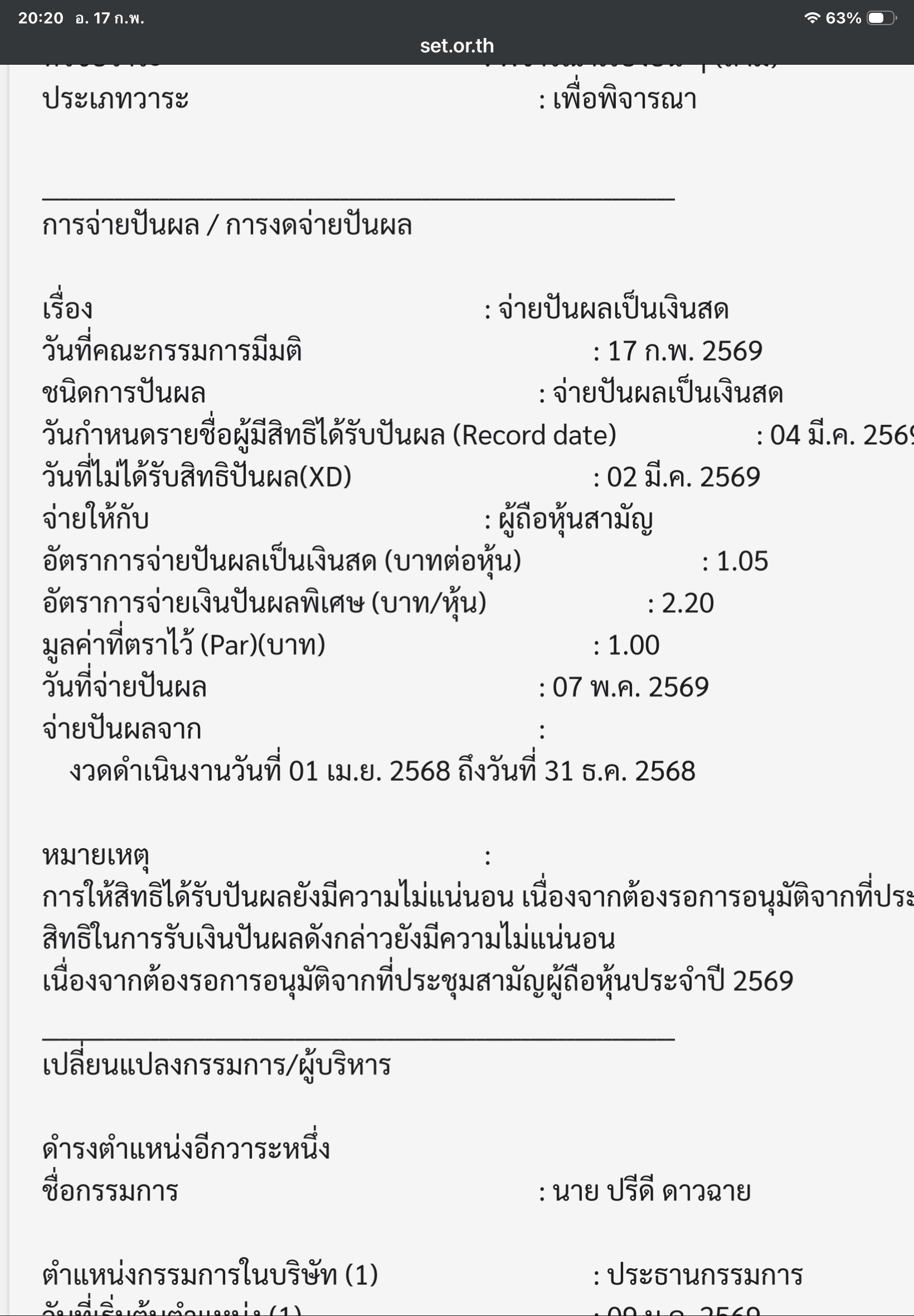 เงินปันผล 3.25 บ. xd 2 มีค 69 จ่าย 7 พค 69 สมกับที่รอคอย