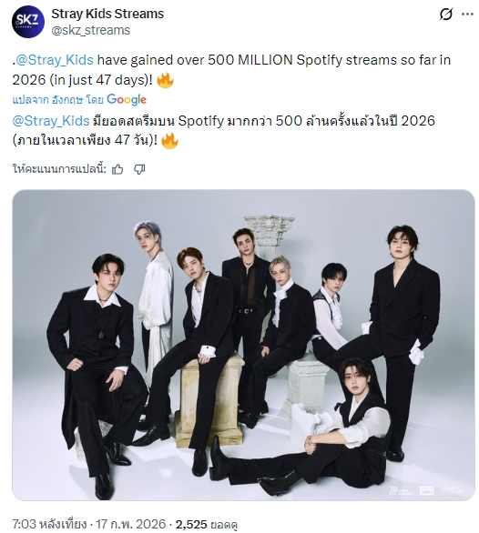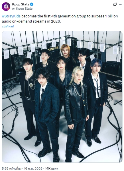 🔥 Stray Kids กลายเป็นศิลปิน K-Pop เจน 4 กลุ่มแรกที่มียอดสตรีมเสียง on-demand ทะลุเกิน 1 พันล้านครั้งในปี 2026 และเฉพาะ Spotify มียอดสตรีม มากกว่า 500 ล้านครั้ง(ภายในเวลาเพียง 47 วัน)!