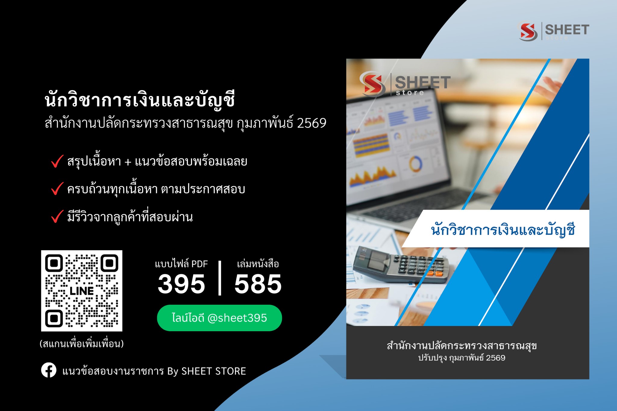 แนวข้อสอบ นักวิชาการเงินและบัญชี สำนักงานปลัดกระทรวงสาธารณสุข ฉบับสมบูรณ์ กุมภาพันธ์ 2569 เตรียมสอบบรรจุในตำแหน่ง นักวิชาการเงินและบัญชี สังกัด สป.สธ. สรุปเนื้อหา+แนวข้อสอบพร้อมเฉลยอธิบาย จัดทำโดยทีมงานมืออาชีพมากประสบการณ์ ครบถ้วนทุกเนื้อหาในเล่มเดียว