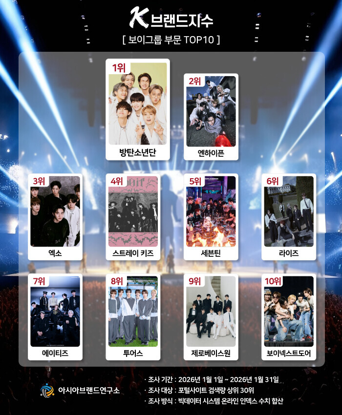 'K-brand Index' ประจำปีนี้ วิเคราะห์ข้อมูลขนาดใหญ่ทางออนไลน์จำนวน 657,862,300 รายการ ตั้งแต่วันที่ 1 มกราคม 2026 ถึง 31 มกราคม 2026 โดยมุ่งเป้าไปที่ 30 อันดับแรกของคำค้นหาที่มีปริมาณมากที่สุดบนเว็บไซต์พอร์ทัลต่างๆ ในการจัดอันดับ K-Brand Index ในหมวดบอยแบนด์ BTS อยู่ในอันดับที่ 1 ตามด้วย ENHYPEN ในอันดับที่ 2, EXO ในอันดับที่ 3, Stray Kids ในอันดับที่ 4, SEVENTEEN ในอันดับที่ 5, RIIZE ในอันดับที่ 6, ATEEZ ในอันดับที่ 7, TWS ในอันดับที่ 8, ZEROBASEONE ในอันดับที่ 9 และ BOYNEXTDOOR ในอันดับที่ 10