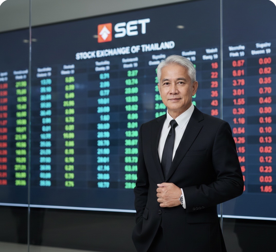 ”สร้างภาพ ผู้ชายอายุ 64 ปี ยืนใส่สูทสีดำ ยืนโพสท่าแบบดูเท่ นิ่ง ขรึม โดยมีฉากหลังเป็นกระดานหุ้นของตลาดหลักทรัพย์แห่งประเทศไทย “