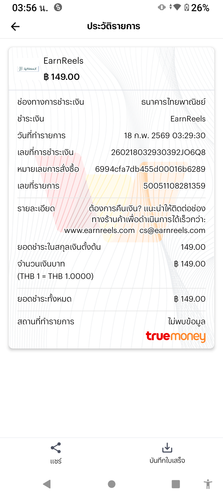 หรือส่งอีเมลไปที่ cs@earnreels.com ก็สามารถขอคืนเงินได้สำเร็จเช่นกัน