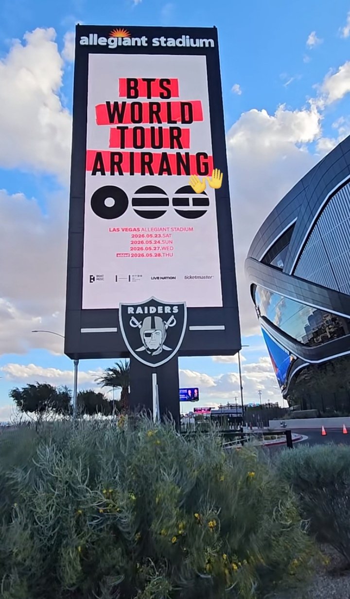 ป้ายต้อนรับเวิลด์ทัวร์ Arirang ของ BTS ที่สนามกีฬา Allegiant Stadium ในแอลเอมาแล้ว ยิ่งใหญ่ สะดุดตา