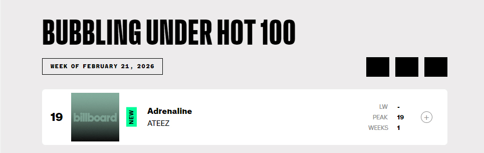 ATEEZ <Adrenaline> เดบิวท์ในอันดับที่ #19 บนชาร์ต Billboard Bubbling Under Hot100 ประจำสัปดาห์นี้.