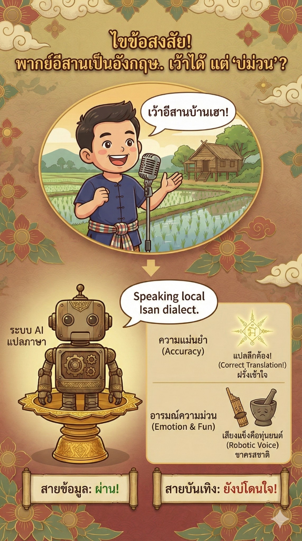 โจทย์ของผมคือ: "ถ้าคลิปเราเป็นภาษาอีสานแท้ๆ ระบบมันจะฟังออกแล้วแปลเป็นเสียงพากย์อังกฤษให้ไหม?"