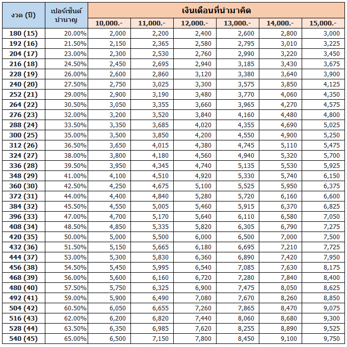 ตารางประมาณการเงินบำนาญชราภาพรายเดือน (15 - 45 ปี)