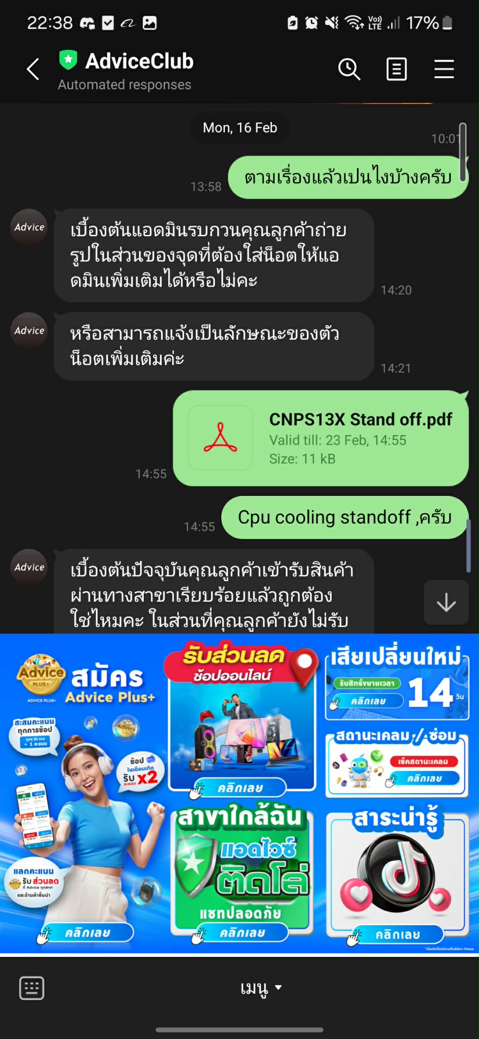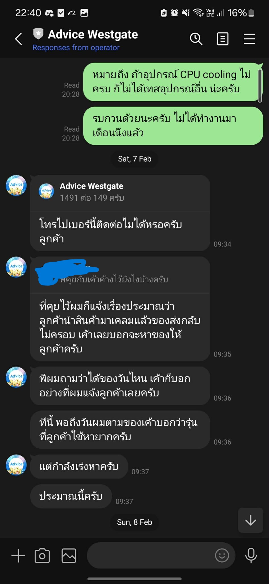 เรื่องมีอยู่ว่า ผมไปเคลมประกัน Motherboard ครับ แล้วทีนี้มีอุปกรณ์คอมตัวนึงติดไปด้วย (CPU Cooling Standoff ) เนื่องจากมันแน่นมากไม่กล้าแกะออก แต่พอส่งเคลมประกันกลับมา ชิ้นส่วนนั้นได้หายไปครับ หายได้ผมเข้าใจ ผมขอให้เค้าช่วยหาของแทนมาสองเดือนแล้ว ปัจจุบันไร้ความคืบหน้า ปัจจุบันนี้คอมหลายหมื่นผมนอนแน่นิ่ง ไม่ได้ทำงานมา 2 เดือนแล้ว รู้สึกเครียดมากครับ ผมไม่ได้อยากประจานนะครับ โทรหาคอลเซนเตอร์เค้าก็ตอบแค่ว่า "จะติดตามเรื่องให้นะคะ"