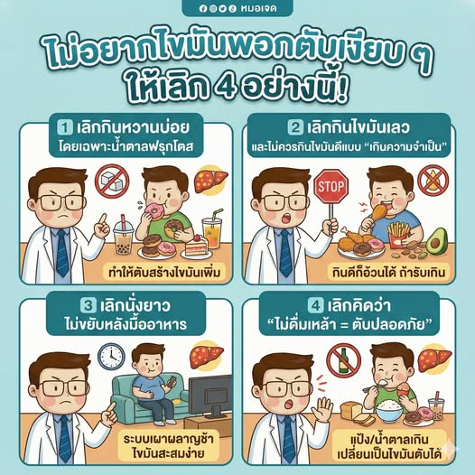 ไขมันพอกตับไม่ได้เตือนก่อนเกิด แต่พฤติกรรมเล็ก ๆ ทุกวันคือชนวนสำคัญ เลิกหวาน เลิกกินเกิน เลิกนิ่งหลังมื้อ และเลิกชะล่าใจว่าตับแข็งแรงเองได้ ตับดูแลเราเงียบ ๆ เราก็ควรดูแลเขากลับให้ทันก่อนสาย เพื่อป้องกันลุกลามเป็นตับอักเสบ พังเรื้อรัง และโรคแทรกซ้อนในอนาคตครับ