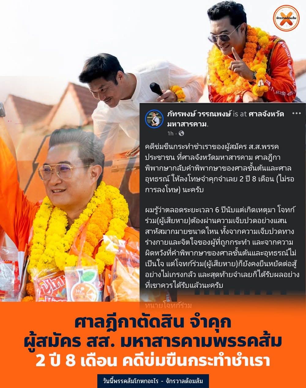 คดีข่มขืนกระทำชำเราของผู้สมัคร ส.ส.พรรคประชาชน ที่ศาลจังหวัดมหาสารคาม ศาลฎีกาพิพากษากลับคำพิพากษาของศาลชั้นต้นและศาลอุทธรณ์ ให้ลงโทษจำคุกจำเลย 2 ปี 8 เดือน (ไม่รอการลงโทษ) นะครับ