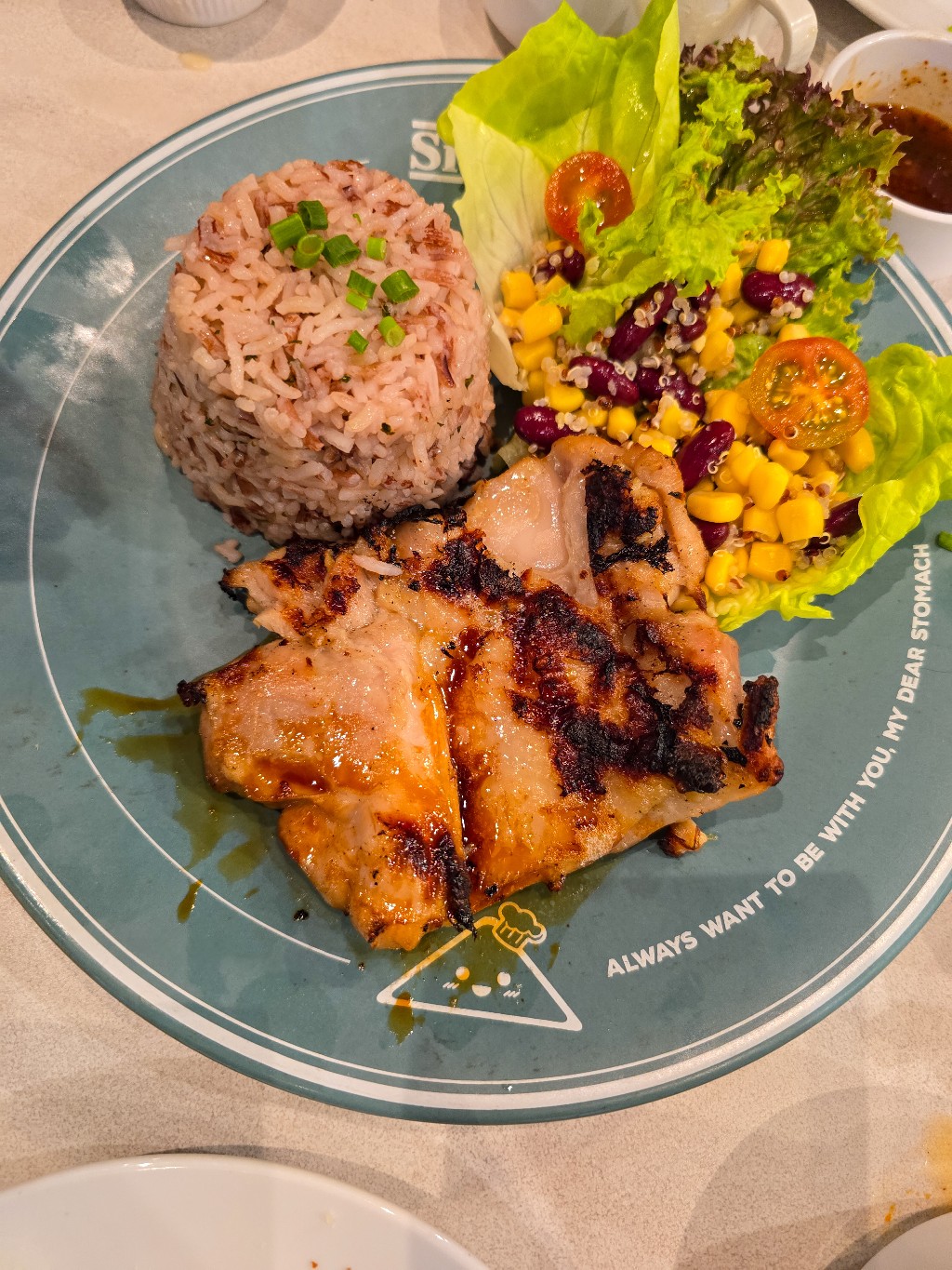 ผมสั่งสเต็กไก่เทอริยากิพร้อมโค้กซีโร่รีฟิล ระหว่างรอสเต็กก็จัดหนักสลัดบาร์ไป 4 จาน ซุปอีก 4 ถ้วยแบบจุกๆ ครับ พอสเต็กมาเสิร์ฟ ผมทานไปได้ประมาณครึ่งชิ้น แฟนผม (สายตาดีมาก) สังเกตเห็นว่าเนื้อไก่ส่วนล่างมัน "ไม่สุก" ครับ เป็นเนื้อสีชมพูใสๆ เลย