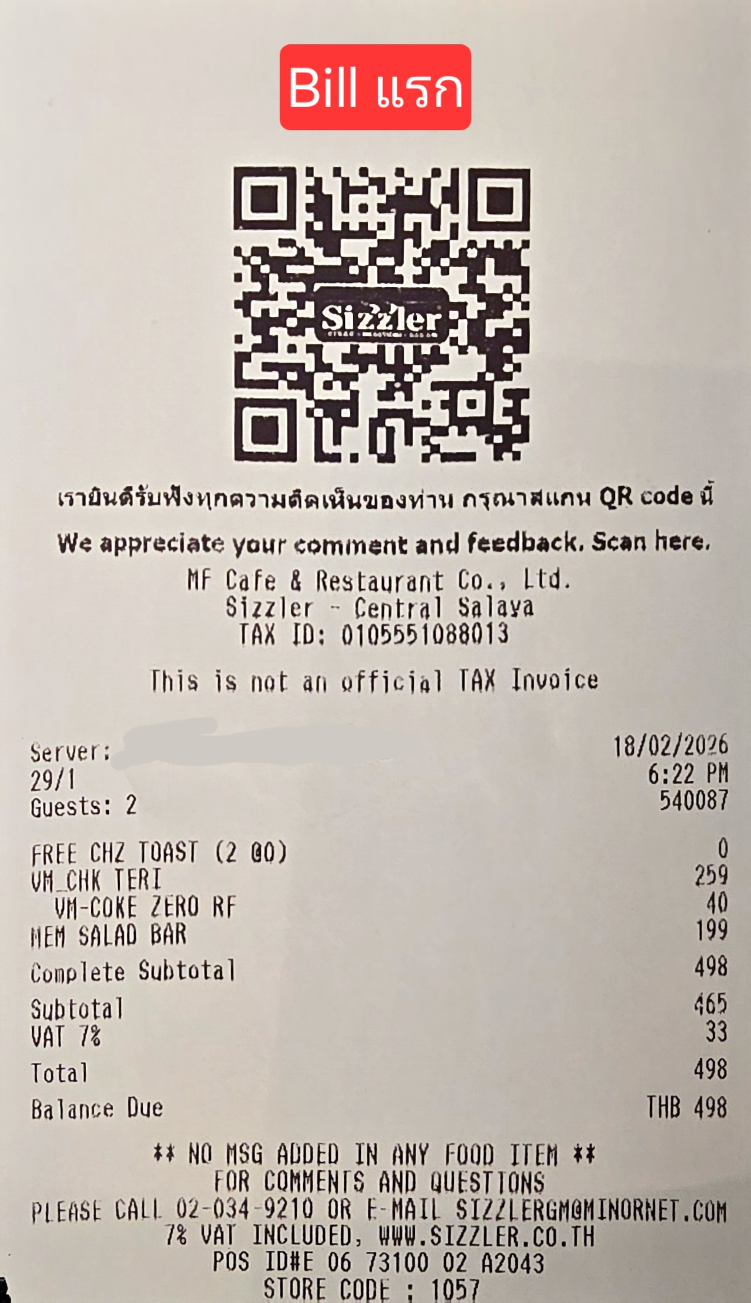 ปกติผมกับแฟนเป็นแฟนตัวยงของ Sizzler อยู่แล้ว เพราะชอบสลัดบาร์มาก เมื่อวานนี้ (18 กุมภาพันธ์ 2569) มีโอกาสแวะไปทานที่สาขา Central Salaya มาครับ แต่ดันเจอเหตุการณ์ "แจ็คพอต" ที่ไม่คาดฝัน เลยอยากจะมาแชร์ประสบการณ์การแก้ปัญหา (Service Recovery) ของพนักงานที่นี่ให้ฟังกันครับ