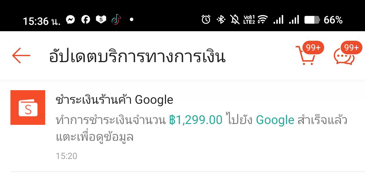 กำลังนั่งทำงานอยู่ มีแจ้งเตือนเข้ามาจากแอป Shopee หักเงิน 1299 ผ่าน Google Play