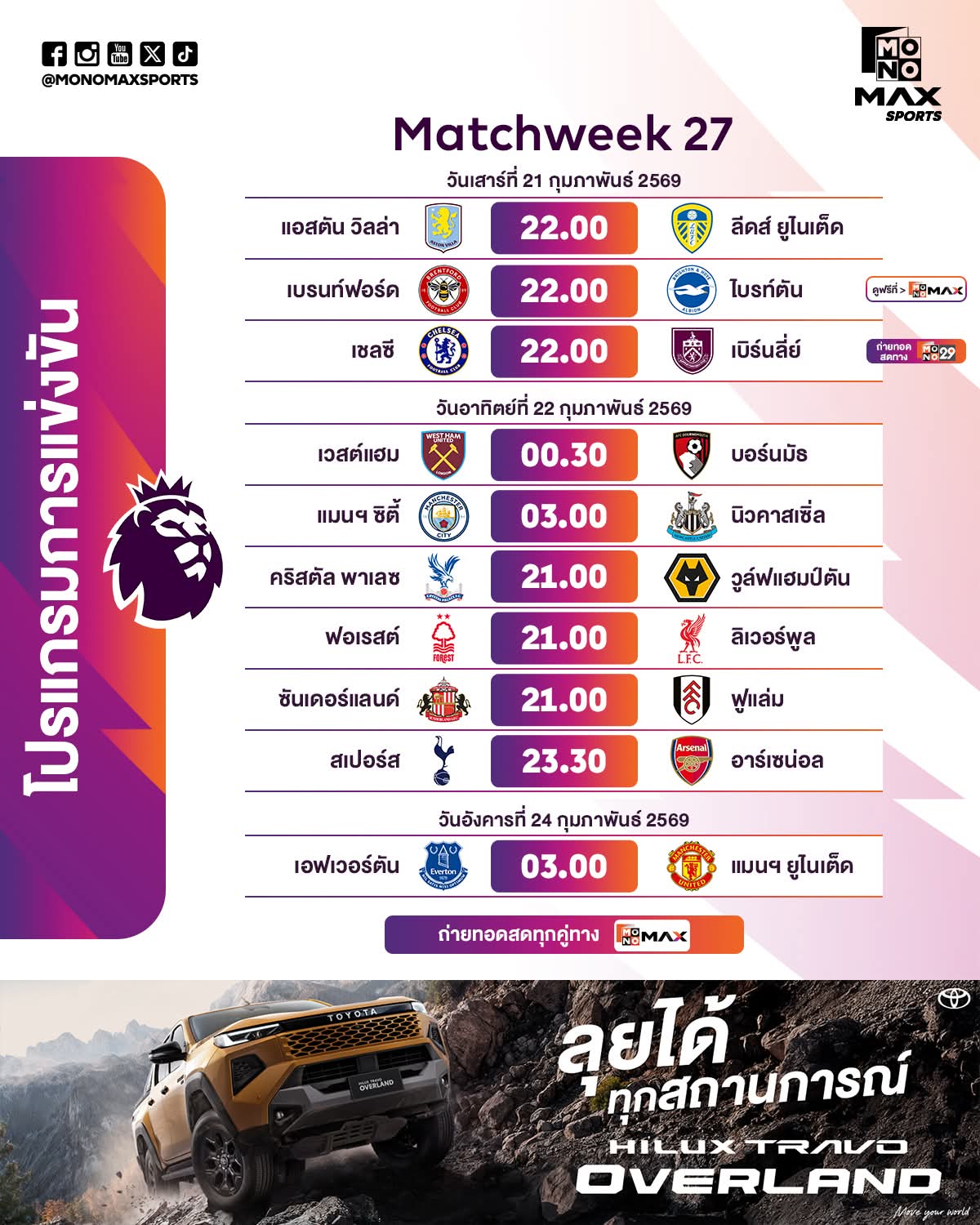 ⚽🏴 #พรีเมียร์ลีก | 🗓️ แมตช์วีคที่ 27 📺 #MONO29 #MONOMAX 🔴