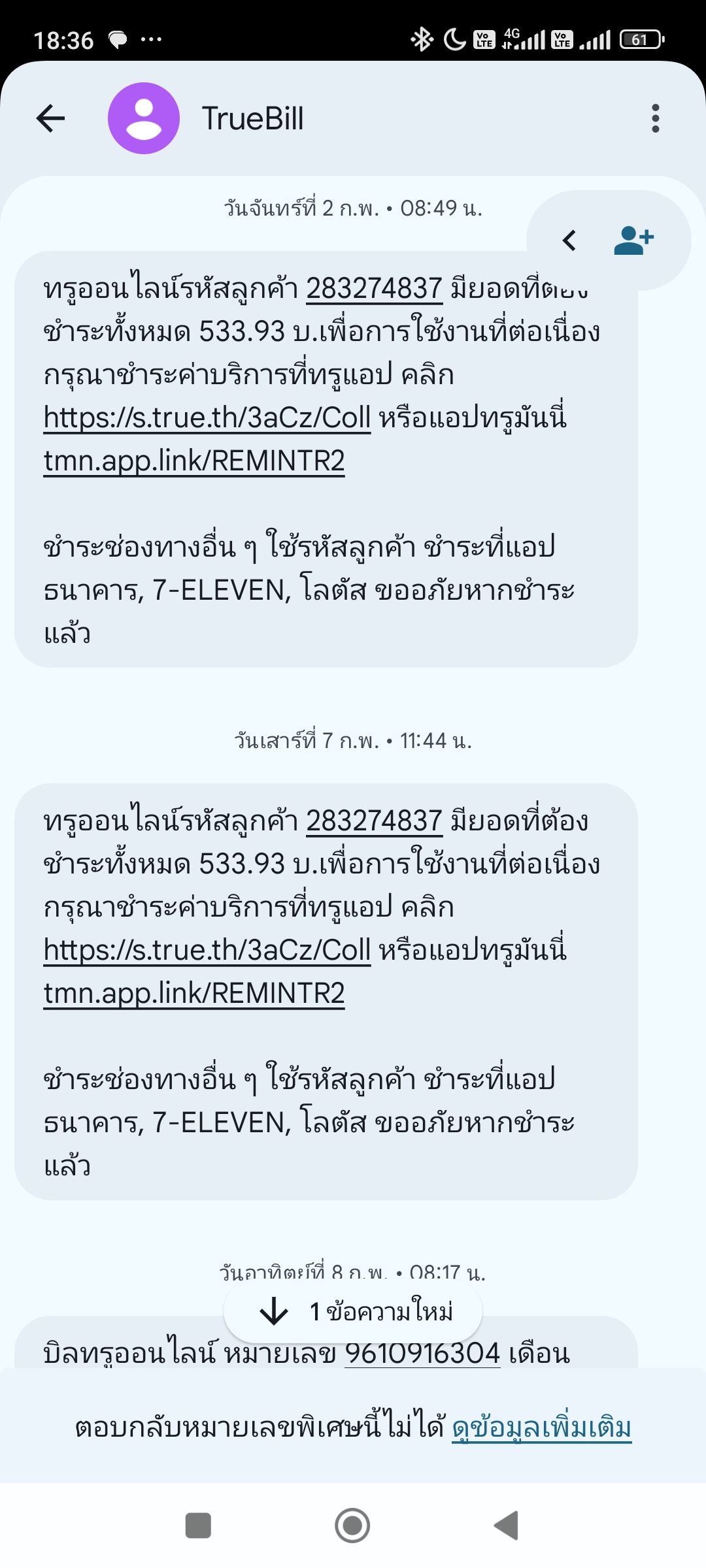 พอดีผมไม่ได้บิลจ่ายเดือนธันวาคม กำหนดชำระของเดือนธันวาคมคือ วันที่ 3 มกราคม และมีข้อความจากทรูแจ้งมาว่า "หมายเลขของคุณกำลังถูกระงับการใช้งาน" แต่ผมไม่ได้ช