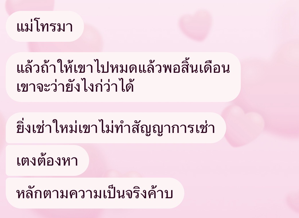 ตามหัวข้อเลยค่ะ ตอนนี้เราเรียนมหาลัยปี3แต่เราอาศัยห้องเพื่อนอยู่ แฟนบอกให้เราไปหาห้องพักแยก ซึ่งเราได้บอกแฟนไปแล้วว่าหอเพื่อนเรามีว่างอยู่1ห้องเดือนละ2,500บาท แต่เข้าอยู่ต้องจ่ายค่าเช่าล่วงหน้า1เดือน+ค่ามัดจำ1,000บาทรวม6,000บาท แต่ค่าเช่าล่วงหน้ากับค่ามัดจำสามารถแบ่งจ่ายครึ่งหนึ่งก่อนได้ คือต้องจ่าย4,250ถึงจะเข้าอยู่ได้ แต่เหมือนแฟนเราเค้าจะไม่เข้าใจว่าค่ามัดจำกับค่าเช่าล่วงหน้าคืออะไร แต่เราก็พยายามอธิบายแต่เหมือนเค้าก็ยังไม่เข้าใจอยู่ดีเราเลยส่งผลการค้นหาในกูเกิ้ลไปว่าค่าเช่าล่วงหน้ากับค่ามัดจำคืออะไร(เดี๋ยวแปะรูปให้ค่ะ) เหมือนเค้าจะเข้าใจแต่พอตกเย็นมาเค้าก็พิมพ์แชทมาแบบนี้(เดี๋ยวแปะรูปให้ค่ะ) เราจะพูดยังไงให้เค้าเข้าใจคะ