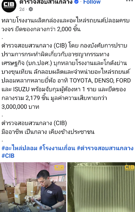 CIB จับ ยึดอะไหล่ปลอม มูลค่าร่วม3ล้าน