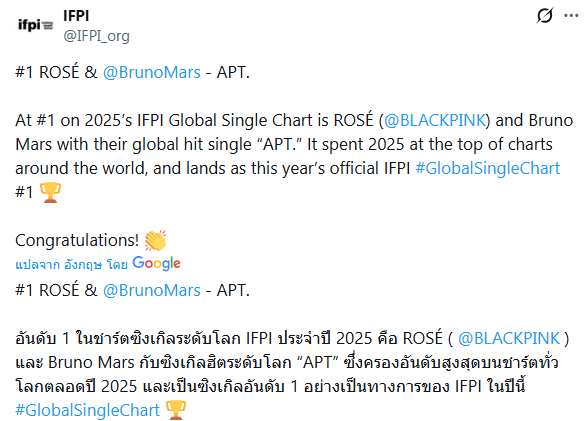 ROSÉ and Bruno Mars' "APT." was the #1 best selling single worldwide in 2025 (via IFPI).