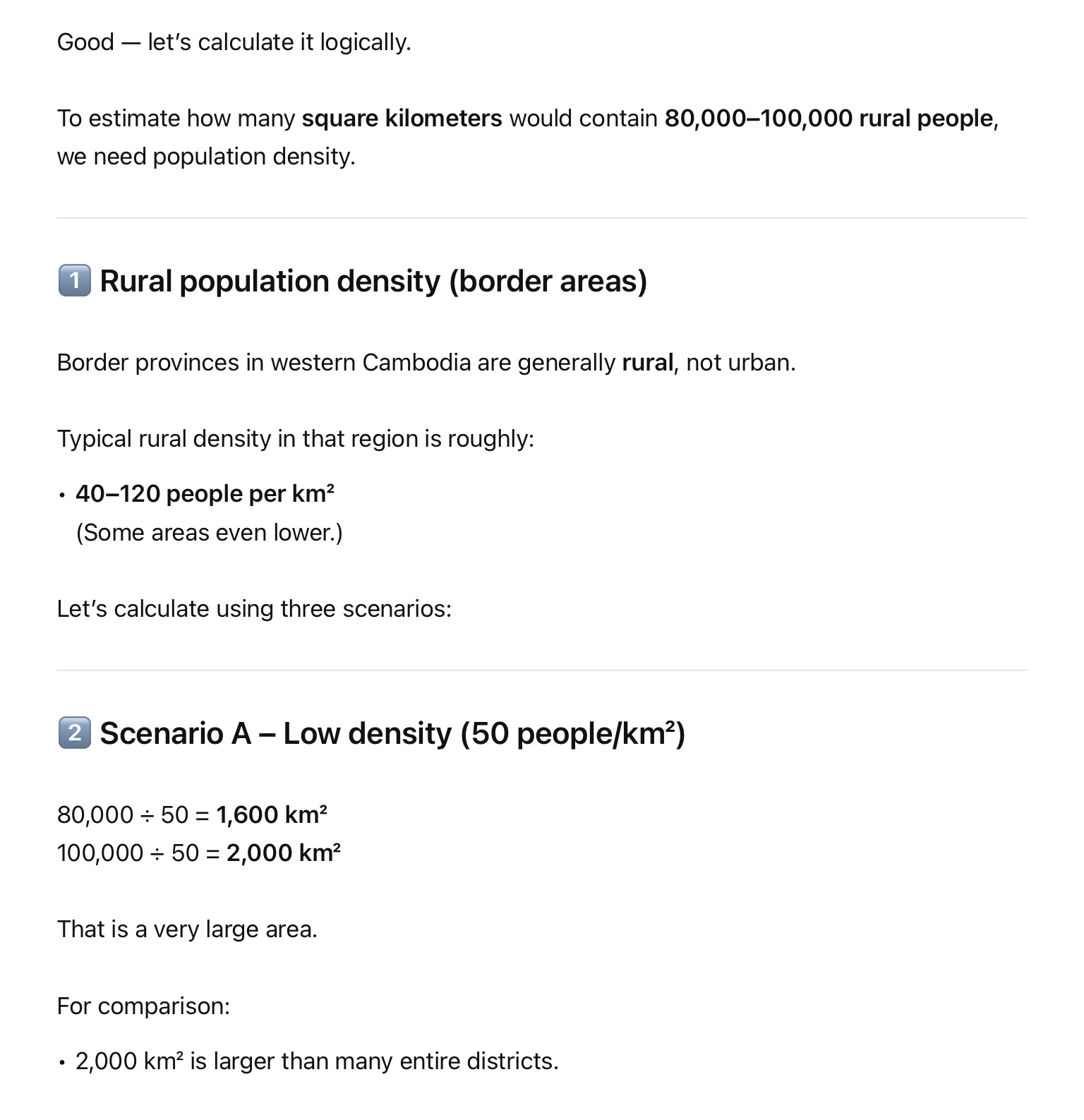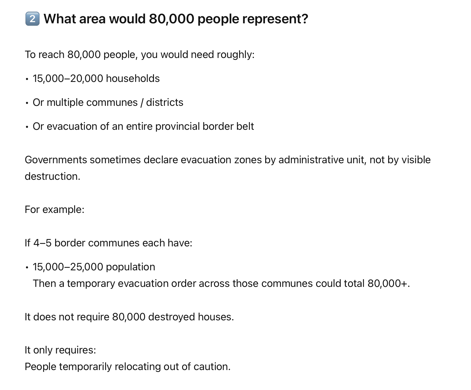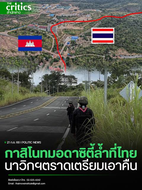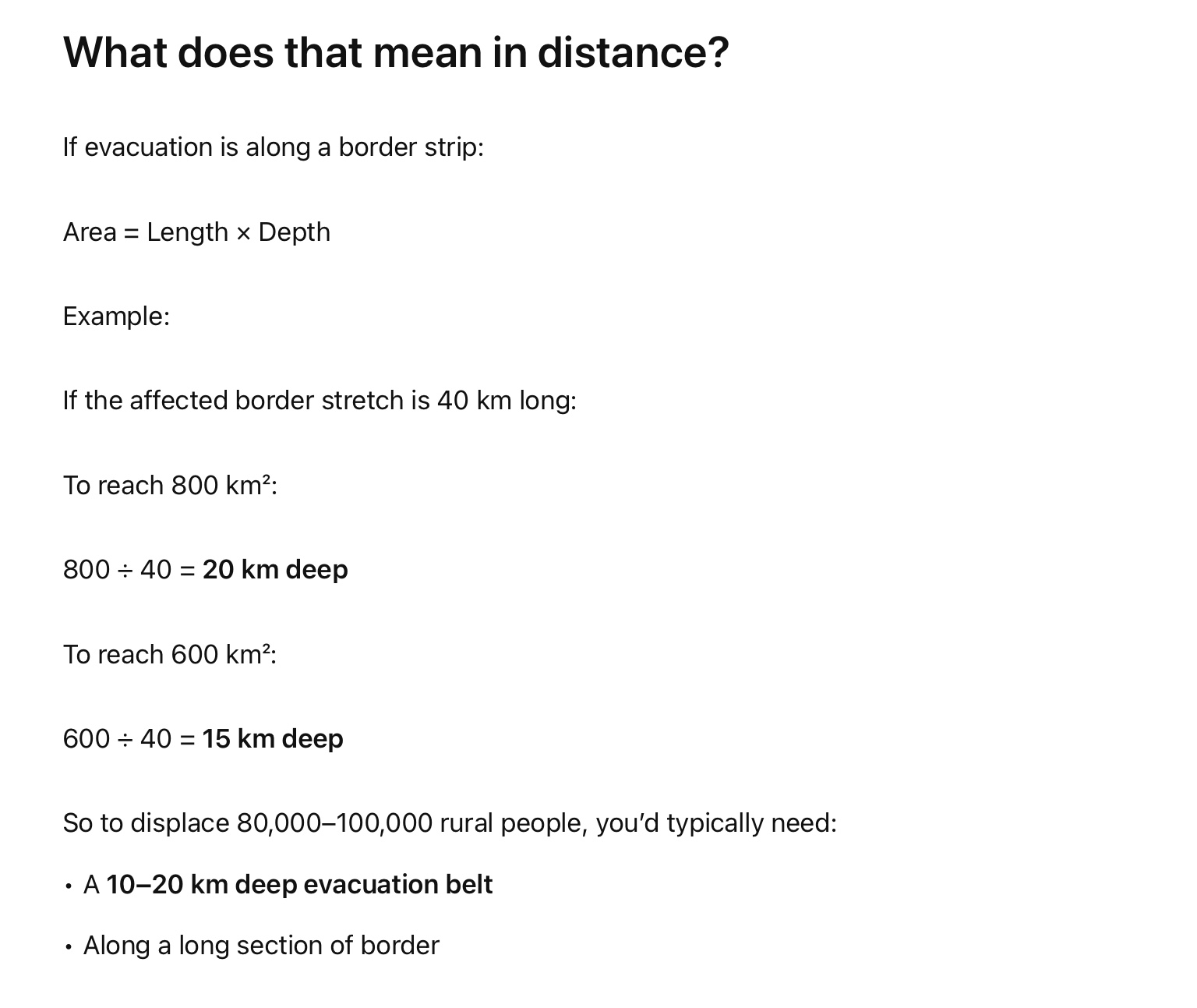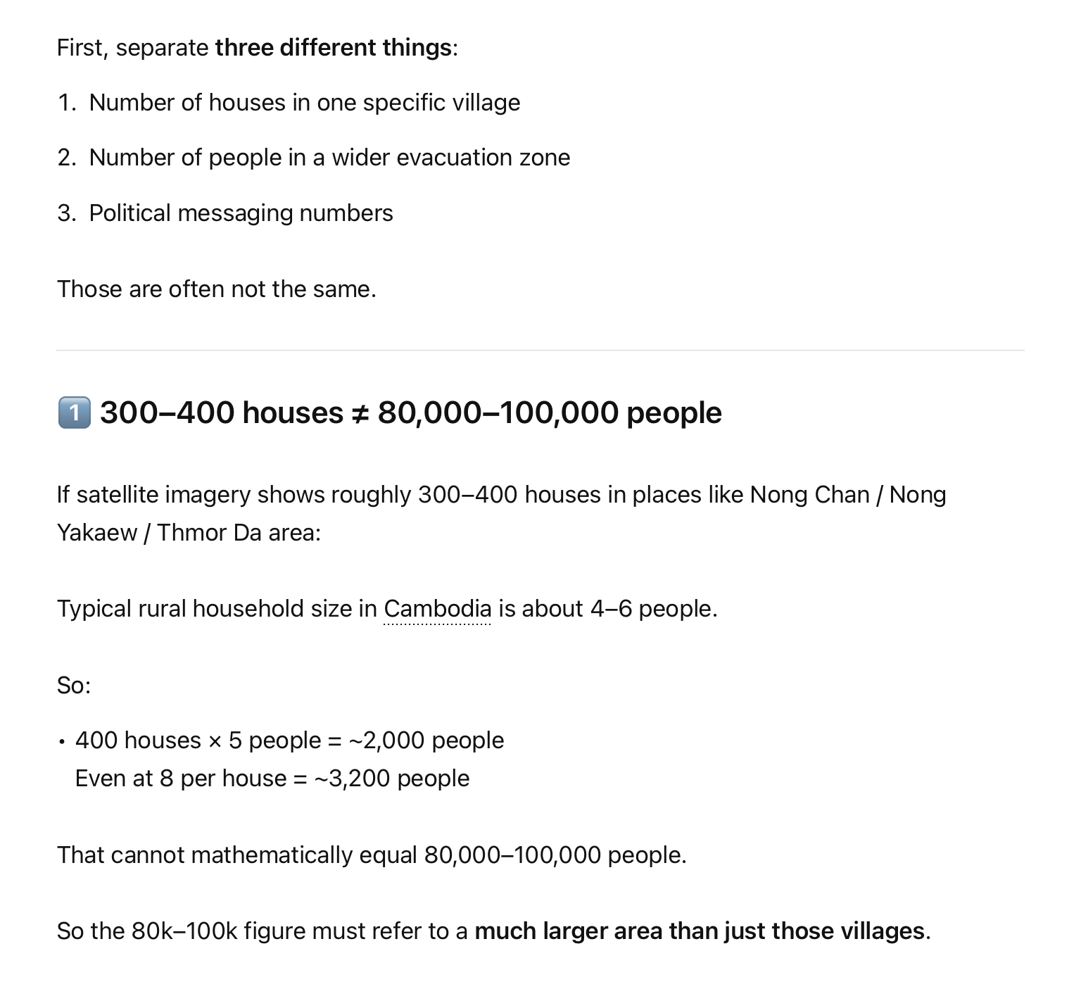 ถ้าจะบอกว่า 100,000 คน ที่ต้องย้ายถิ่น นี่มันพื้นที่ประมาณไหนเหรอ? 10-20 กิโลเมตร จากแนวเขตเแดนหรือเปล่า? เขมรก็ไม่ได้ถอยไปไกลขนาดนั้นไหม? ไอ้ฟ่านจีนเทา แก็งค์นกคุ้มหลี ยังมาป่วน เย้วๆ หน้าแนวอยู่เลย แว๊นแมงกะไซเขมร มาถ่ายรูปเล่นหน้าตู้คอนเทนเนอร์ ต้องขยันขับมา 20 กิโล เพื่อมาป่วนเหรอ?