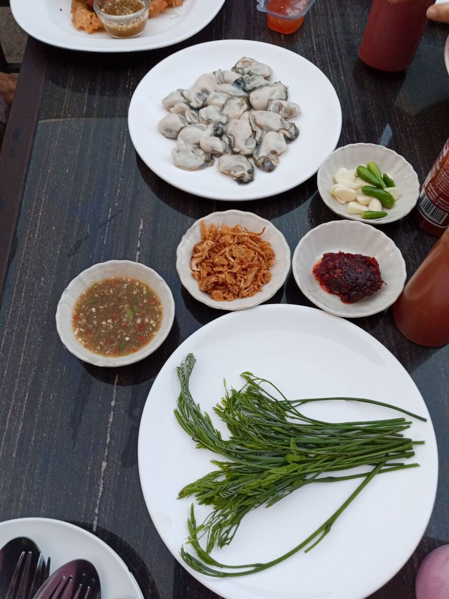 หอยนางรมทรงเครื่อง หอยตัวโตดี กระถิน หอมเจียว พริกเผา ครบเครื่อง ๆ