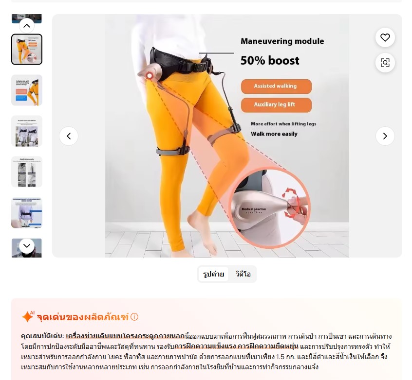 * กลไกการทำงาน: ใช้เซนเซอร์ AI ตรวจจับจังหวะการเดิน เมื่อเรายกขา มอเตอร์จะส่งแรงผลัก (แรงบิดประมาณ 15 นิวตันเมตร) ช่วยลดภาระของร่างกายได้ถึง 30% - 50%