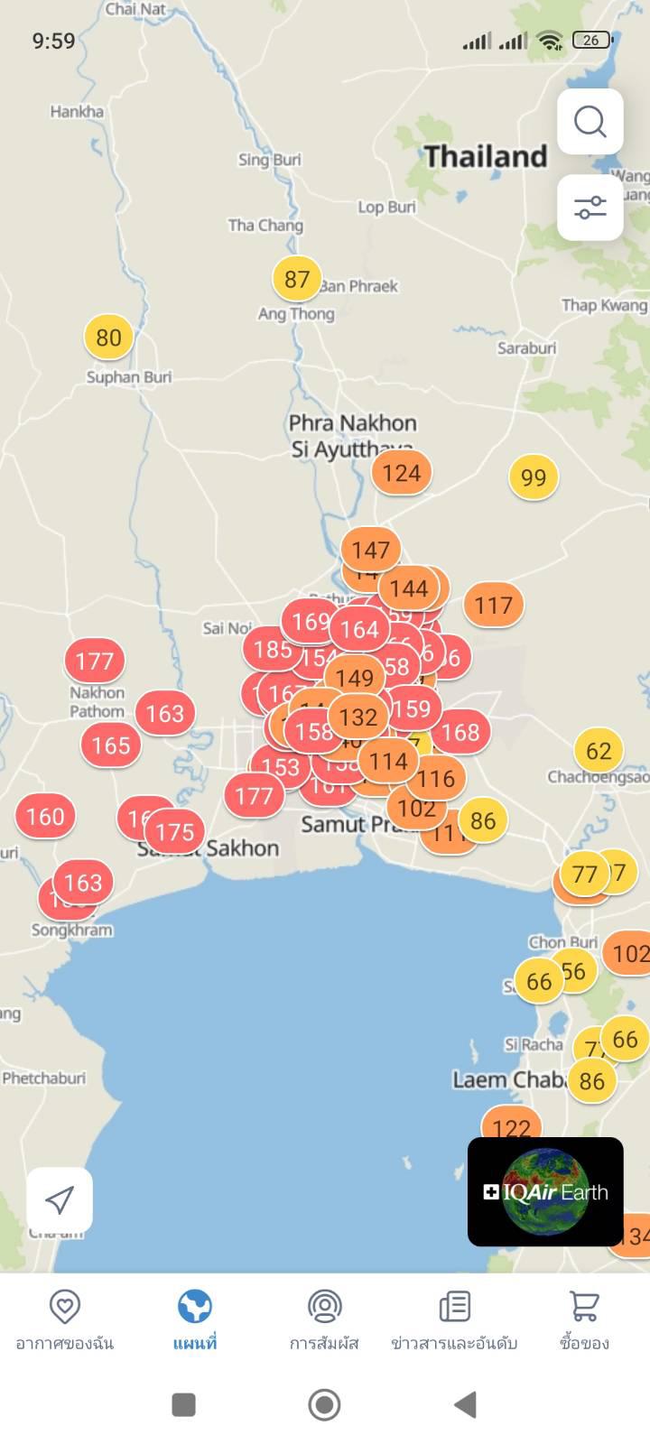 วันนี้ค่าฝุ่น PM 2.5 ในเขตพื้นที่กรุงเทพและบริเวณใกล้เคียงสูงมาก