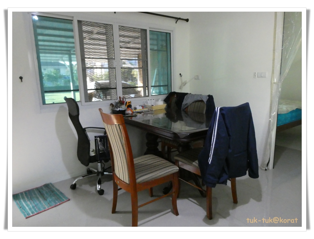 ความสูงของขาต่ำสุดไม่พอดีโต๊ะทำงาน สูงกว่านี้ก็สูงไป แก้โดยใช้ข้อต่อตรงท่อเอสลอนที่เห็นสีฟ้า สวมเข้าที่ขาทั้งสี่ ยึดให้นิ่งโดยการยัดฟองน้ำ