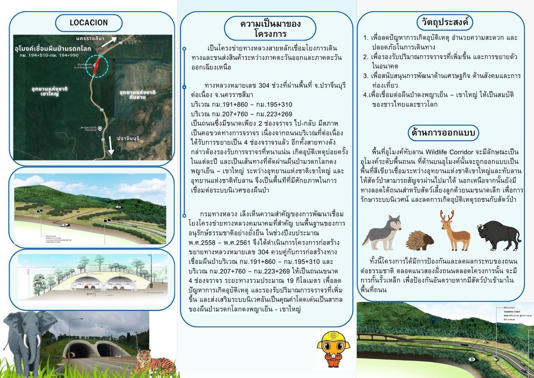 ในการนี้ กรมทางหลวงได้รายงานแนวคิดการก่อสร้างอุโมงค์เชื่อมผืนป่า บนทางหลวงหมายเลข 304 ซึ่งเป็นเส้นทางหลักที่ตัดผ่านพื้นที่อุทยานแห่งชาติเขาใหญ่และอุทยานแห่งชาติทับลาน ซึ่งเป็นพื้นที่ป่ามรดกโลก โดยออกแบบเป็นอุโมงค์ระดับพื้นถนน และจัดให้มีพื้นที่ด้านบนเป็นทางเชื่อมให้สัตว์ป่าสามารถสัญจรได้อย่างปลอดภัย สอดคล้องกับสภาพพื้นที่และพฤติกรรมสัตว์ป่า ทั้งนี้ โครงการดังกล่าวเป็นการบูรณาการร่วมกันระหว่างกรมทางหลวง กระทรวงทรัพยากรธรรมชาติและสิ่งแวดล้อม และหน่วยงานด้านการอนุรักษ์ทรัพยากรธรรมชาติและสิ่งแวดล้อม เพื่อพัฒนาโครงสร้างพื้นฐานควบคู่กับการคุ้มครองระบบนิเวศอย่างสมดุล