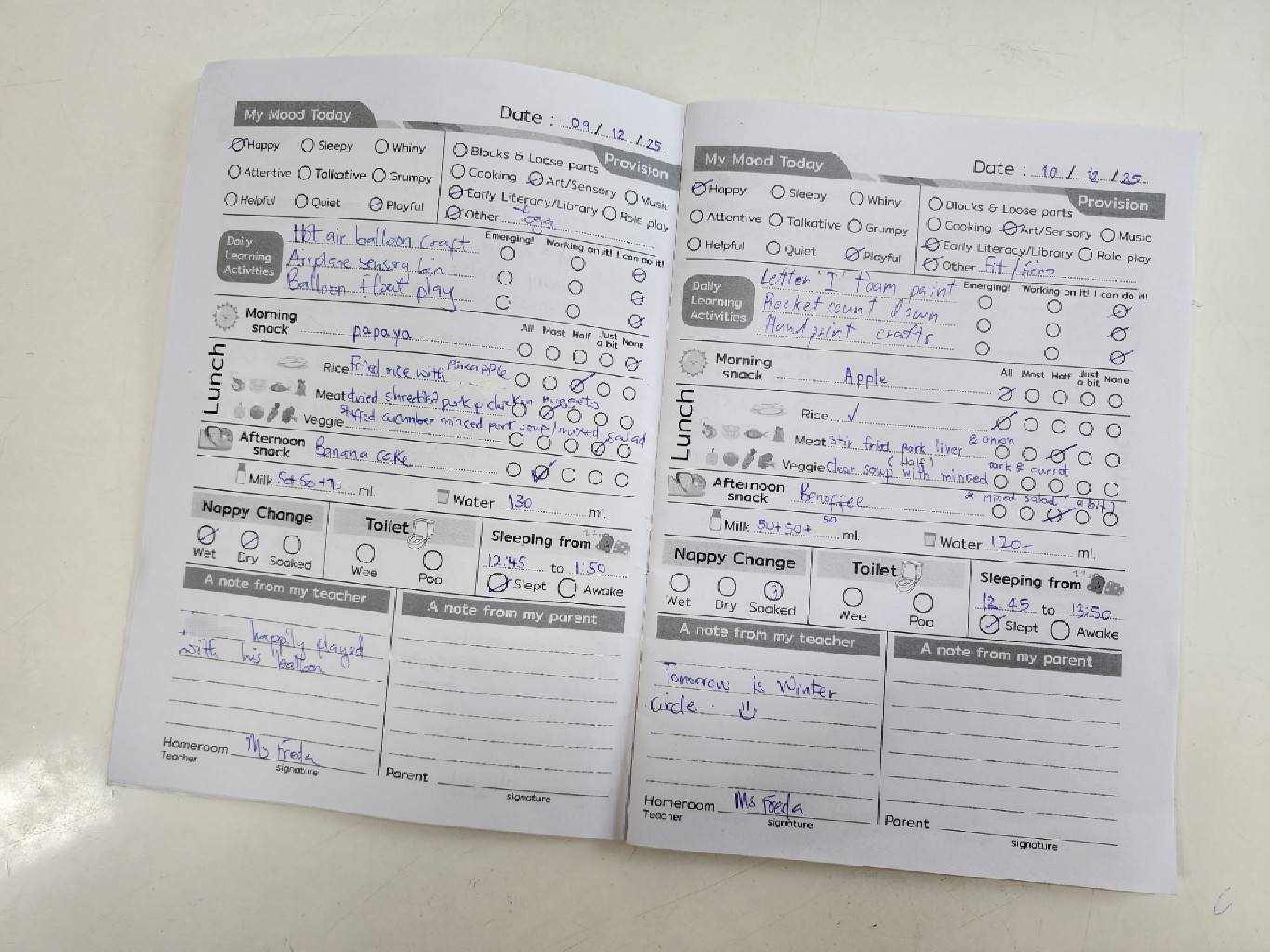 อีกอย่างที่เราชอบมาก ๆ คือ Caring Diary ทุกวันจะได้คุยกับคุณครูประจำชั้น มีการอัปเดตพัฒนาการ อารมณ์ การกิน การนอน รายละเอียดเล็ก ๆ ที่ทำให้รู้สึกว่าเขาใส่ใจจริง ๆ โรงเรียนใหญ่ ๆ บางที่ที่เราไปดูมา จะเข้าถึงคุณครูประจำชั้นค่อนข้างยาก อันนี้ถือเป็นจุดที่เรารู้สึกต่างมาก และก็มีแอป Tapestry ที่จะโพสรูปลูก พร้อมบอกว่าสัปดาห์นี้เรียนเรื่องอะไร ได้พัฒนาทักษะไหนบ้าง