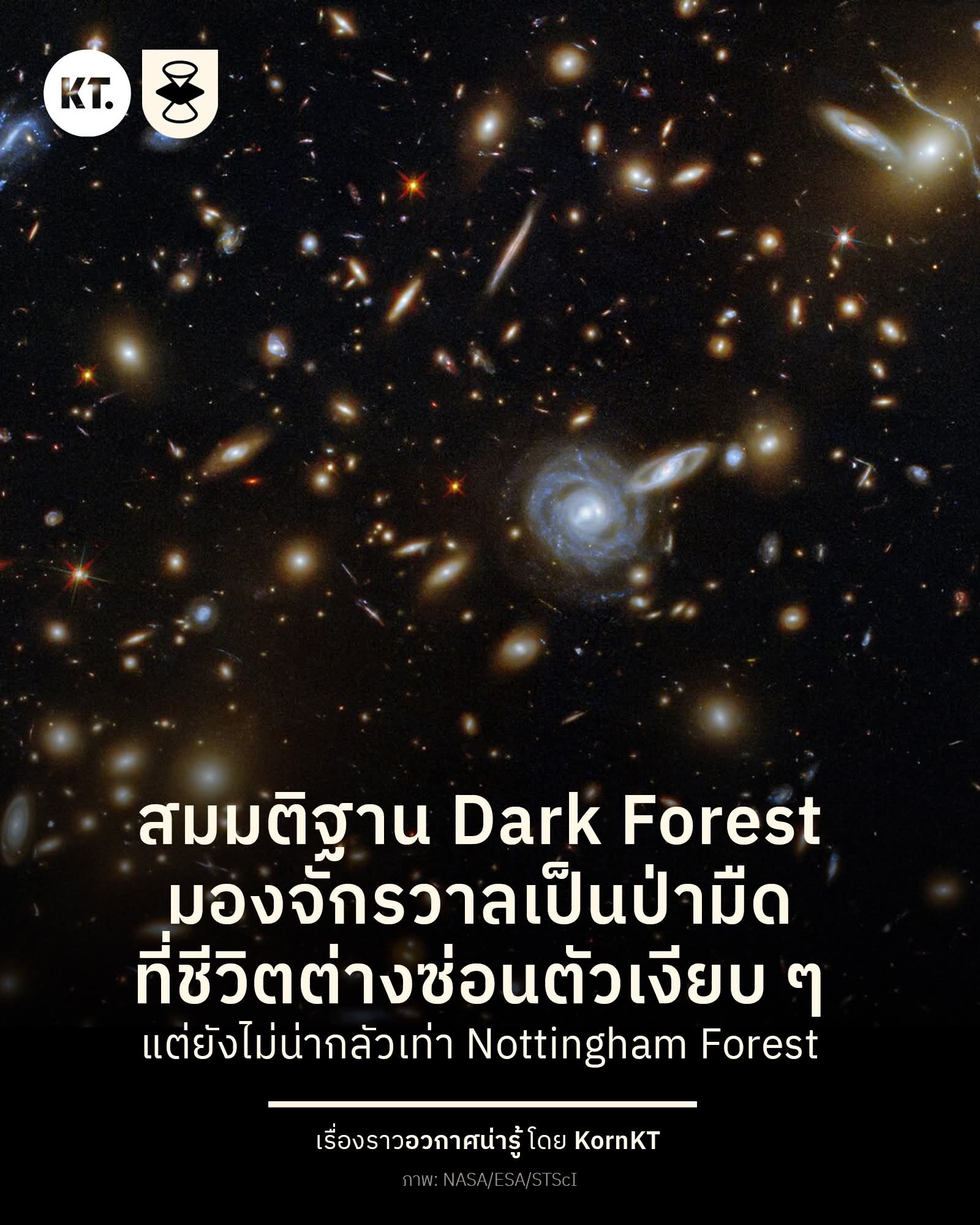 ที่จักรวาลอันกว้างใหญ่นี้กำลังเงียบเชียบ อาจไม่ใช่เพราะไม่มีใครอยู่ข้างนอกนั้น แต่อารยธรรมต่าง ๆ อาจมองว่าห้วงอวกาศนั้นคือป่ามืด ที่เราไม่ควรส่งเสียงบอกตำแหน่งออกไป เพราะไม่มีทางรู้ได้เลยว่าอารยธรรมอื่น ๆ ในห้วงอวกาศลึก จะเป็นมิตรหรือศัตรูได้